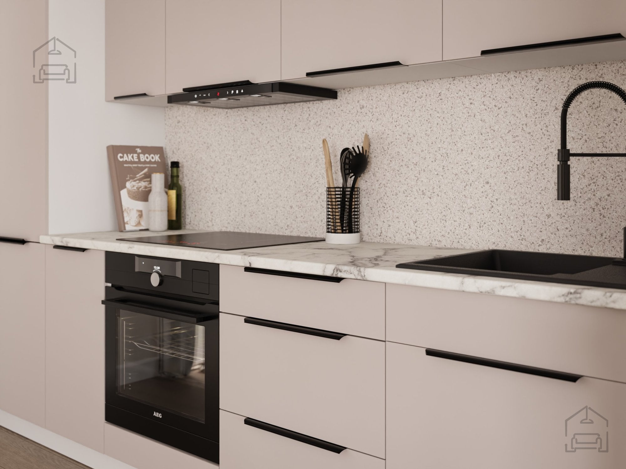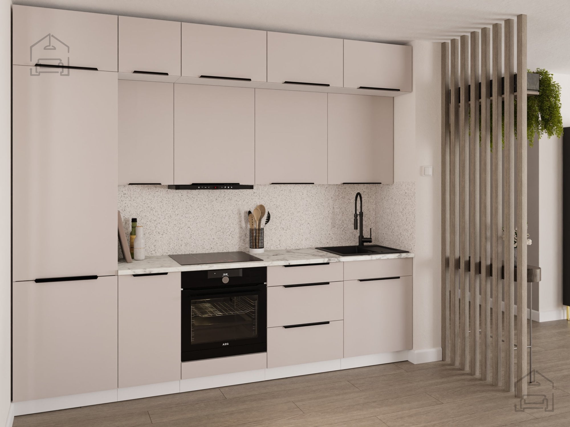 Poseben poudarek je namenjen tudi ročajem. Vgrajeni so ročaji edge UA-HEXA v črno-aluminijasti izvedbi, ki s svojo minimalistično obliko dopolnjujejo sodoben značaj kuhinje. Razmik med ročaji znaša od 64 mm do 320 mm, kar omogoča ergonomsko uporabo in prilagoditev različnim elementom sestava. Takšni ročaji so hkrati trpežni in estetsko dovršeni, njihova mat črna površina pa se lepo ujema z nevtralnimi toni front.