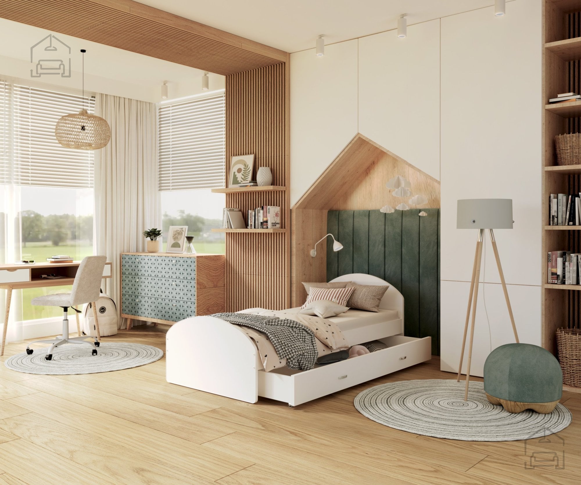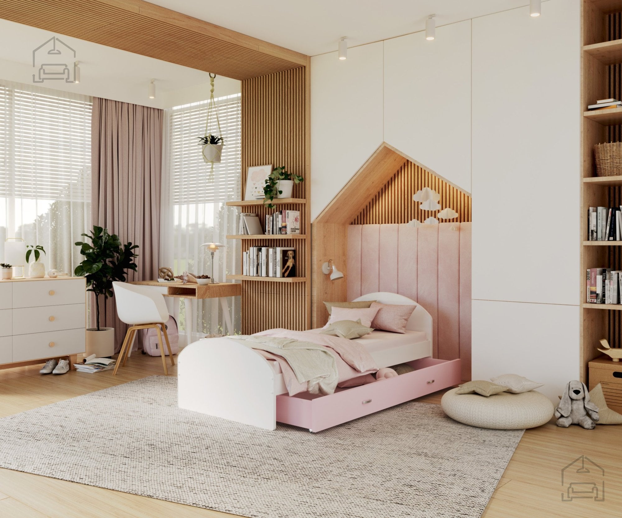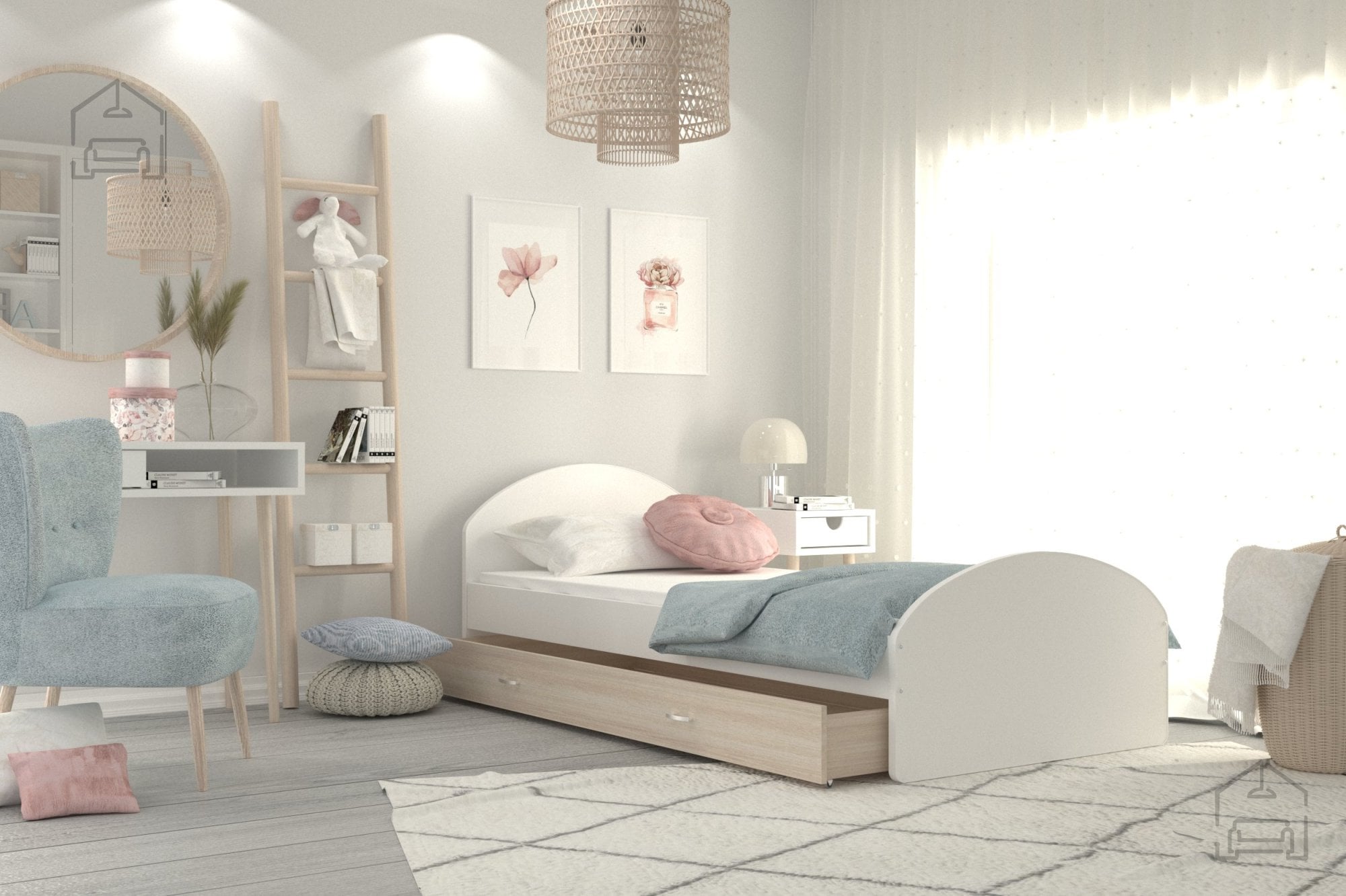 Otroške sobe morajo biti urejene premišljeno, saj prostor pogosto zahteva veliko shranjevanja in prilagodljivosti. Ta postelja je idealna izbira za tiste, ki želijo združiti funkcionalnost in estetiko. Čeprav ne vsebuje predala za posteljnino, jo je zaradi prostega prostora pod ležiščem mogoče kombinirati s škatlami ali zabojčki za shranjevanje igrač, oblačil ali drugih otroških pripomočkov. Tako lahko prostor ostaja urejen, otroška soba pa zračna in prijetna.