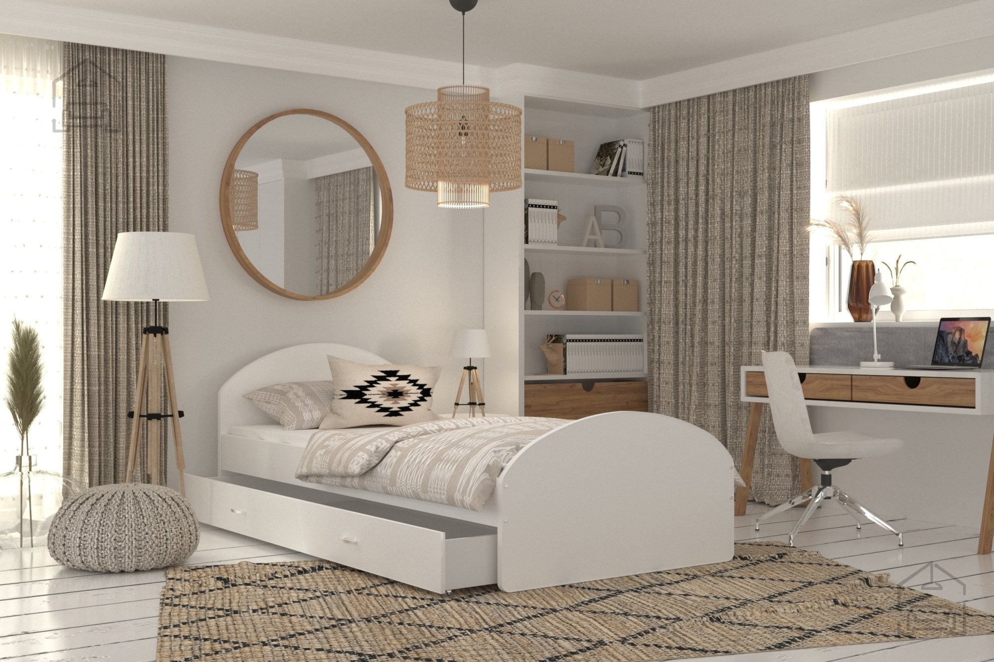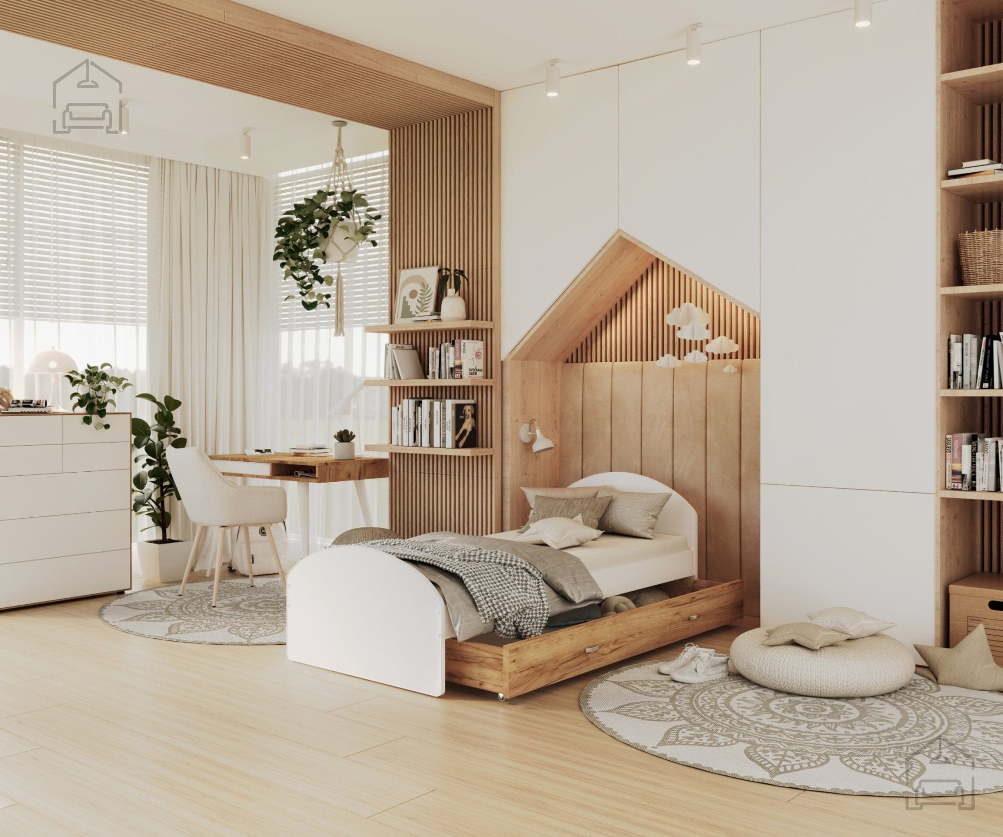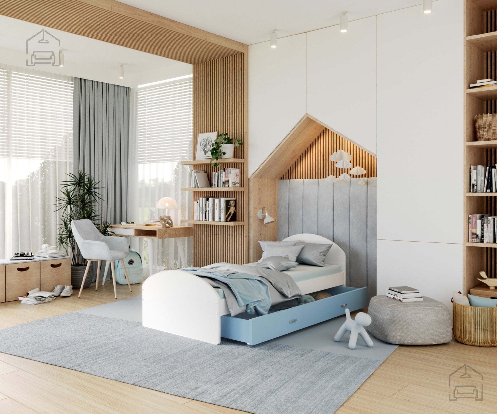 Otroške sobe morajo biti urejene premišljeno, saj prostor pogosto zahteva veliko shranjevanja in prilagodljivosti. Ta postelja je idealna izbira za tiste, ki želijo združiti funkcionalnost in estetiko. Čeprav ne vsebuje predala za posteljnino, jo je zaradi prostega prostora pod ležiščem mogoče kombinirati s škatlami ali zabojčki za shranjevanje igrač, oblačil ali drugih otroških pripomočkov. Tako lahko prostor ostaja urejen, otroška soba pa zračna in prijetna.