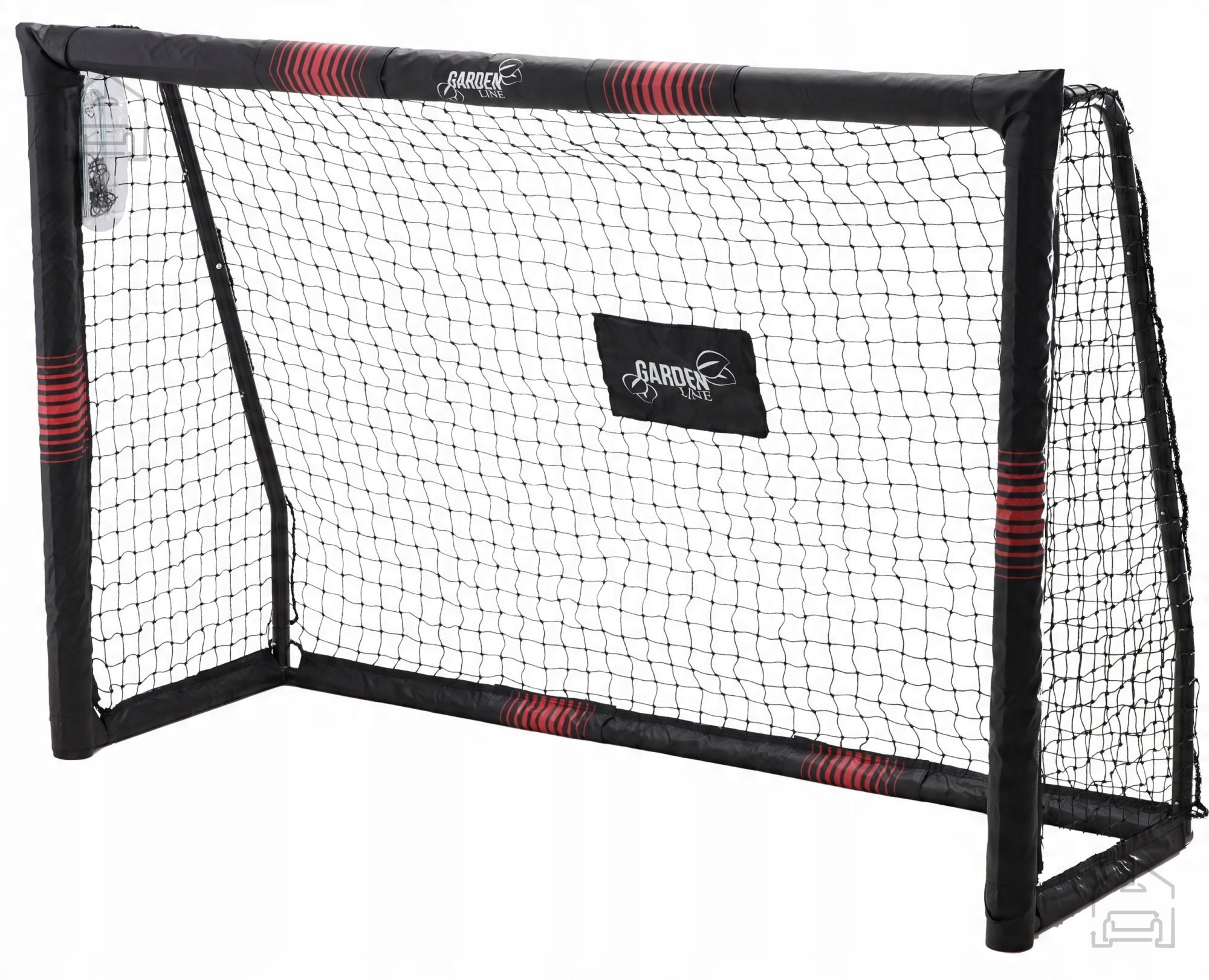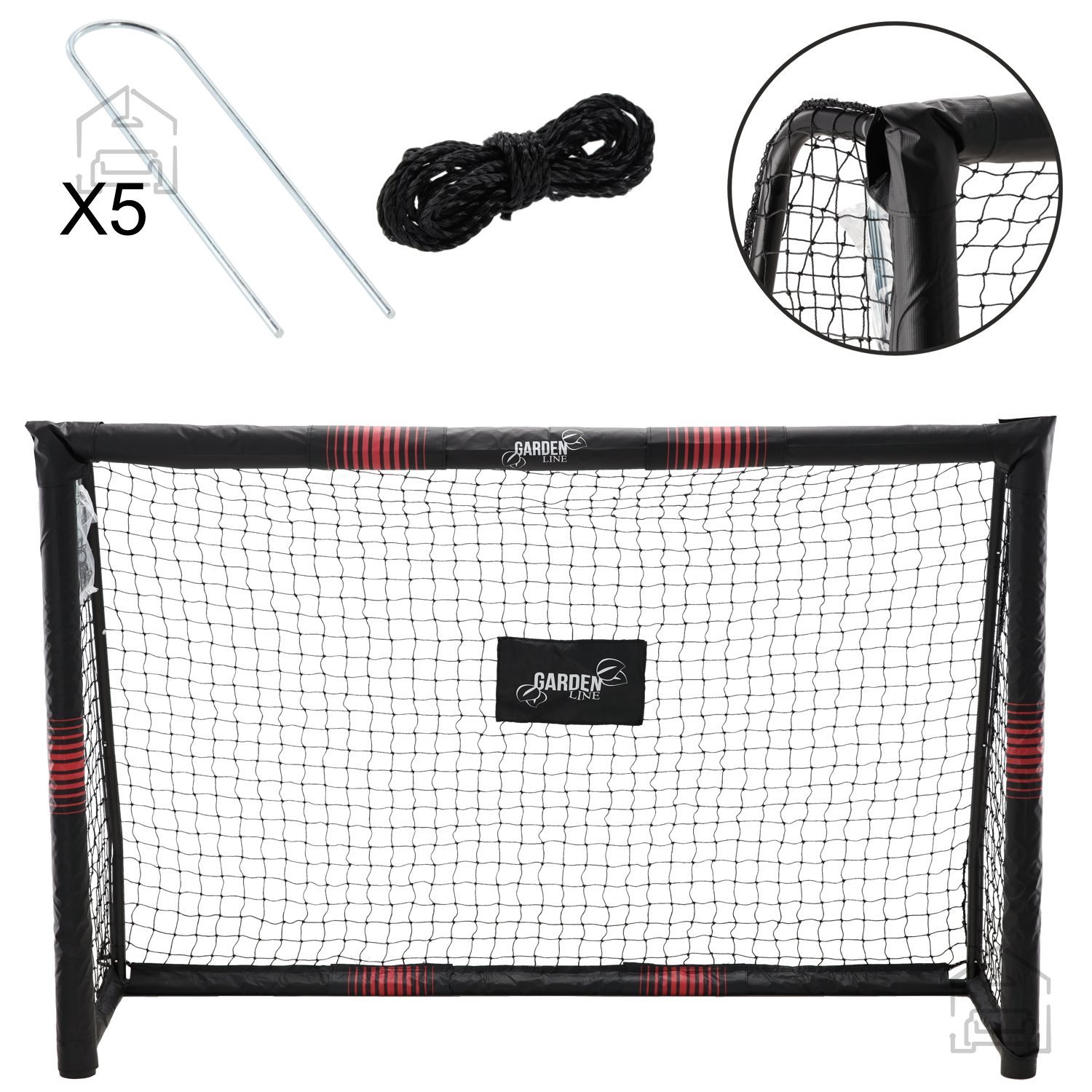 Okvir gola je izdelan iz kakovostnega pocinkanega jekla, ki zagotavlja odpornost proti rjavenju in mehanskim poškodbam. Tak material omogoča dolgo življenjsko dobo tudi pri zahtevnih vremenskih razmerah. Zunanja zaščita iz EPE pene ne služi le estetskemu učinku, temveč hkrati ščiti uporabnike pred udarci ob okvir, kar je še posebej pomembno pri igri z otroki. Montažni sistem je premišljen tako, da omogoča hitro sestavljanje in razstavljanje – posamezni deli se povezujejo s klik-sistemom, kar močno skrajša čas postavitve. Pet priloženih sidrnih količkov poskrbi, da gol ostane stabilen tudi med močnimi udarci žoge ali vetrovnimi razmerami.