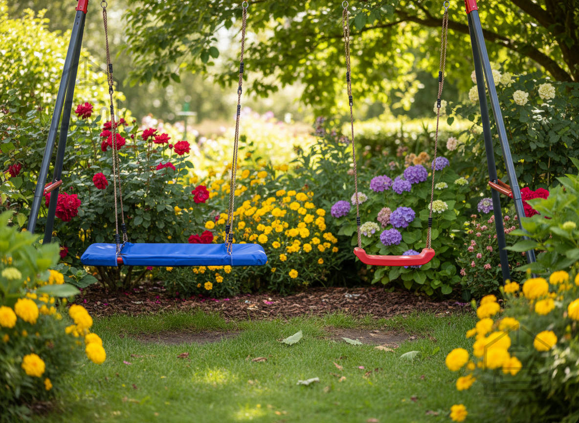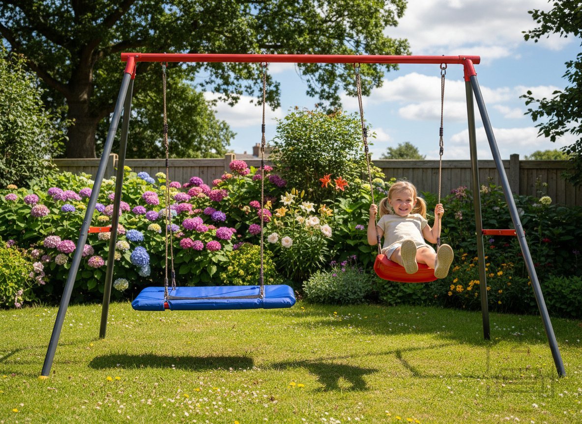 Zaradi barvne kombinacije rdeče in modre se gugalnica lepo ujema s sodobnimi in klasičnimi zunanjimi prostori. Barve so odporne na bledenje, zato ohranjajo živahnost tudi po dolgotrajni izpostavljenosti soncu. Gugalnica ne zahteva posebnega vzdrževanja – občasno čiščenje z vlažno krpo in pregled spojev zadošča za varno uporabo skozi vse leto. Primerna je za namestitev na trdni, ravni podlagi na vrtu, terasi ali dvorišču.