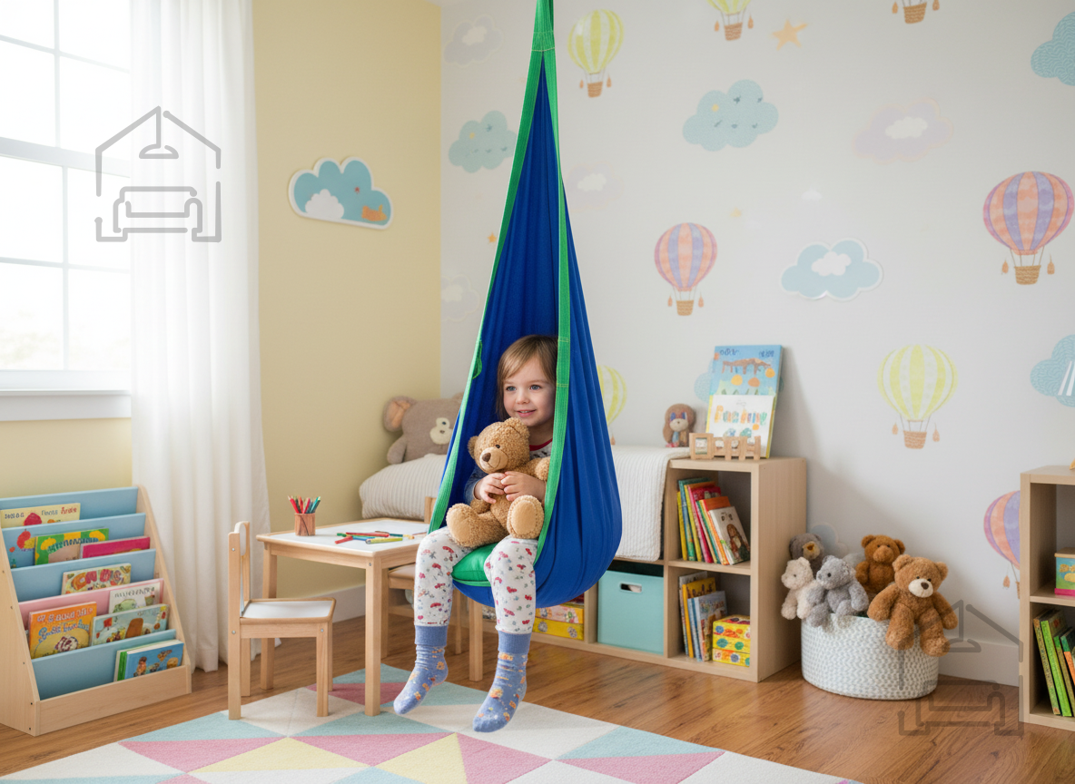 Ta kokon je idealen za otroke, ki iščejo svoj miren kotiček ali prostor za igro. Oblika kokona nežno objame telo in nudi občutek varnosti, kar pripomore k sprostitvi po aktivnem dnevu. V njem lahko otrok bere knjigo, posluša glasbo ali se le rahlo ziba. Modra tkanina deluje pomirjujoče in se lepo ujema z različnimi barvnimi kombinacijami otroških sob. Zaradi preproste montaže ga lahko hitro prestavite z enega prostora v drugega, kar omogoča večnamensko uporabo skozi vse leto.