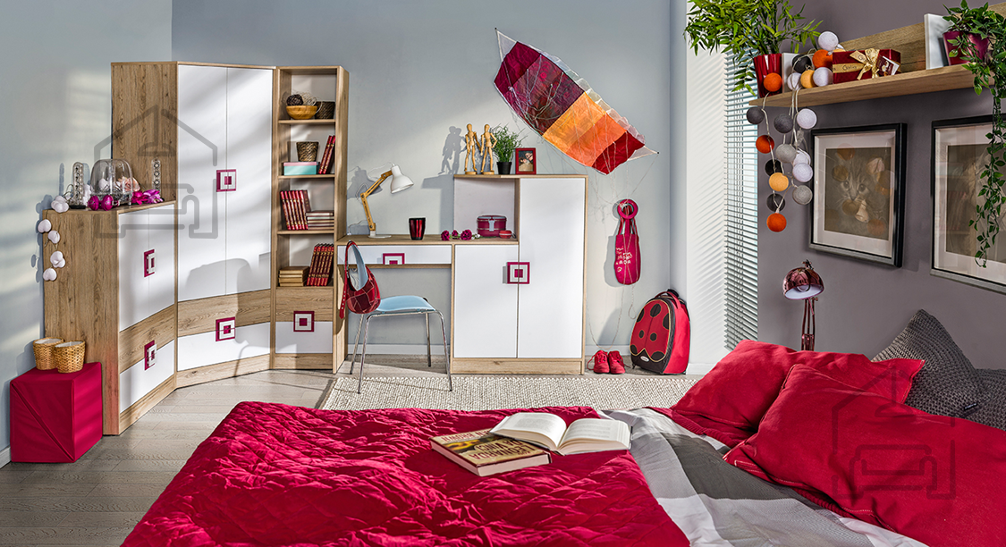 Barvna zasnova sobe Nico je skrbno uravnotežena. Ohišje in fronte so v odtenku svetlega hrasta in bele, kar prostoru doda občutek svetlobe in topline. Ročaji v beli in rožnati barvi dodajo igriv, otroški značaj, zato se soba lepo ujema tako z nežnim kot z živahnejšim dekorjem. Takšna kombinacija omogoča, da bo soba rasla skupaj z otrokom – od prvih let naprej.