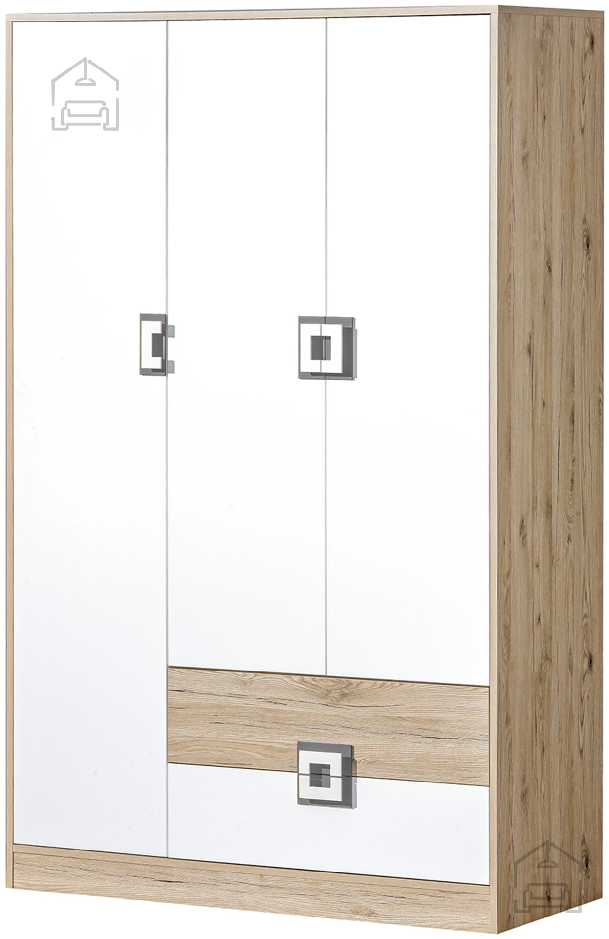 Garderobna omara Nico 3 znamke Domel združuje naravno toplino lesnega videza z moderno funkcionalnostjo. Zunanjost v odtenkih svetlega hrasta in sive barve ustvarja prijeten kontrast, ki se lepo ujema z različnimi slogi notranje opreme – od sodobnega minimalizma do klasične domačnosti. Omara je zasnovana kot praktičen kos pohištva za spalnice, predsobe ali garderobne prostore, kjer je pomembna urejenost in estetska usklajenost.