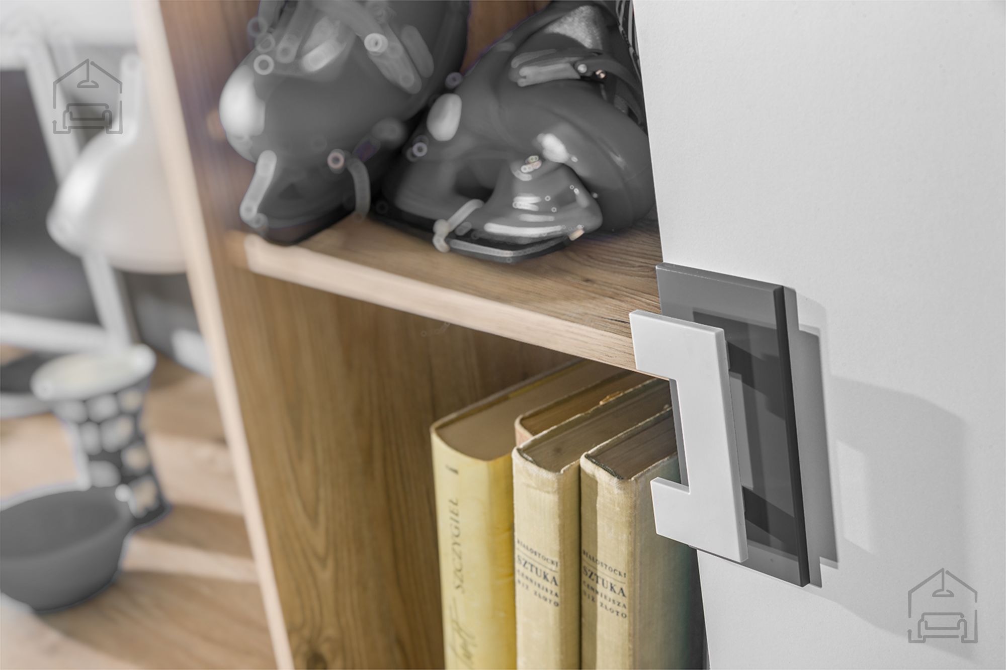 Ročaji regala so v beli in sivi barvi, kar vizualno dopolnjuje osnovni ton hrasta. Ta subtilen kontrast prispeva k modernemu karakterju pohištva. Površina laminata je matirana, kar zmanjšuje vidnost prstnih odtisov in omogoča lažje vzdrževanje. Robovi so natančno obdelani in zaključeni, kar preprečuje krušenje materiala in podaljšuje življenjsko dobo.