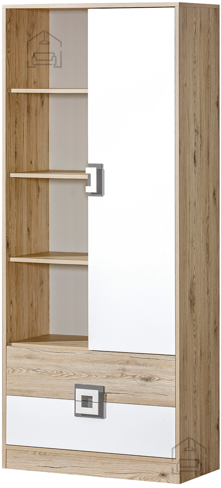 Regal Nico 4 je prostoren in funkcionalen kos pohištva, ki združuje toplino svetlega hrasta z nevtralno eleganco sive in bele barve. S svojo višino 190 cm, širino 80 cm ter globino 40 cm nudi dovolj prostora za shranjevanje knjig, dekorativnih predmetov ali vsakodnevnih potrebščin. Izdelan je iz kakovostne iverne laminirane plošče debeline 16 mm, kar zagotavlja dobro stabilnost in dolgo življenjsko dobo. Regal je bil izdelan v tovarni Domel na Poljskem, kjer je znanost natančne izdelave povezana z zanesljivo kakovostjo.