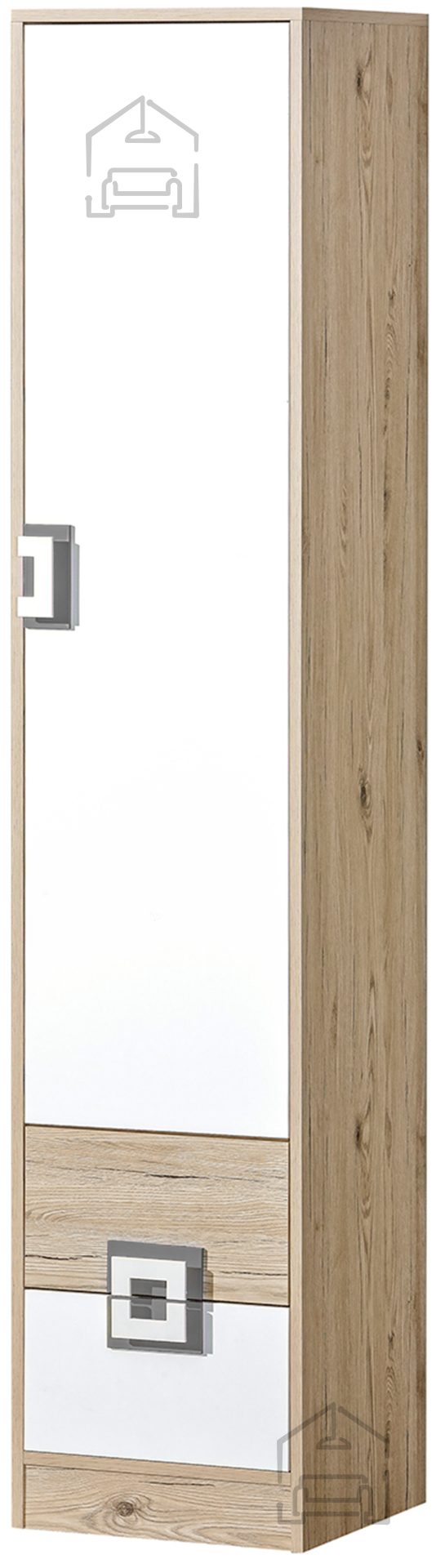 Kombinacija hrasta svetlega in sive ustvarja sodoben kontrast, ki se lepo poda k številnim barvnim shemam notranje opreme. Hrast svetli daje prostoru naravno toplino, medtem ko siva doda pridih sodobne umirjenosti. Bela in siva barva ročajev dopolnjujeta celotno podobo regala in poudarjata njegov minimalističen značaj. Takšna barvna kombinacija omogoča, da se regal Nico 5 uspešno vključi v različne stile – od skandinavskega in modernističnega do klasičnega z naravnimi poudarki.