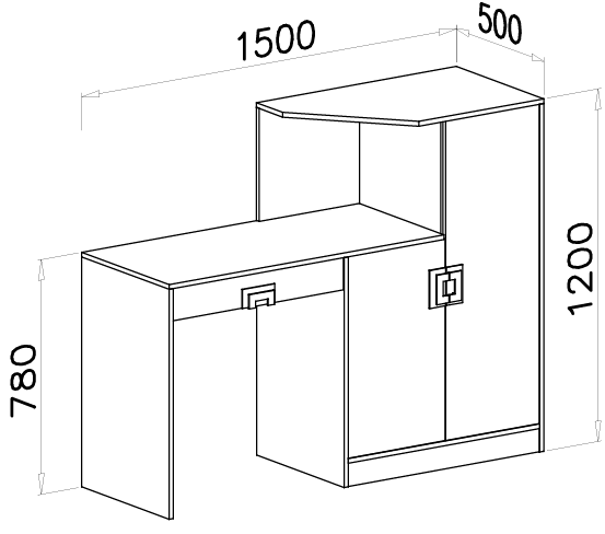 Celotne dimenzije kompleta so 150x50×120 cm, kar omogoča optimalen izkoristek prostora brez občutka utesnjenosti. Širina 150 cm nudi dovolj delovne površine za računalnik, pisarniške pripomočke in dokumente, medtem ko globina 50 cm omogoča udobno namestitev tudi v manjših prostorih. Višina 120 cm vključuje dodatne police ali nadgradnjo, ki poveča prostornino za shranjevanje. Takšna razporeditev je idealna za tiste, ki si želijo urejeno delovno okolje, kjer je vse pri roki, a hkrati ni odvečnega nereda.