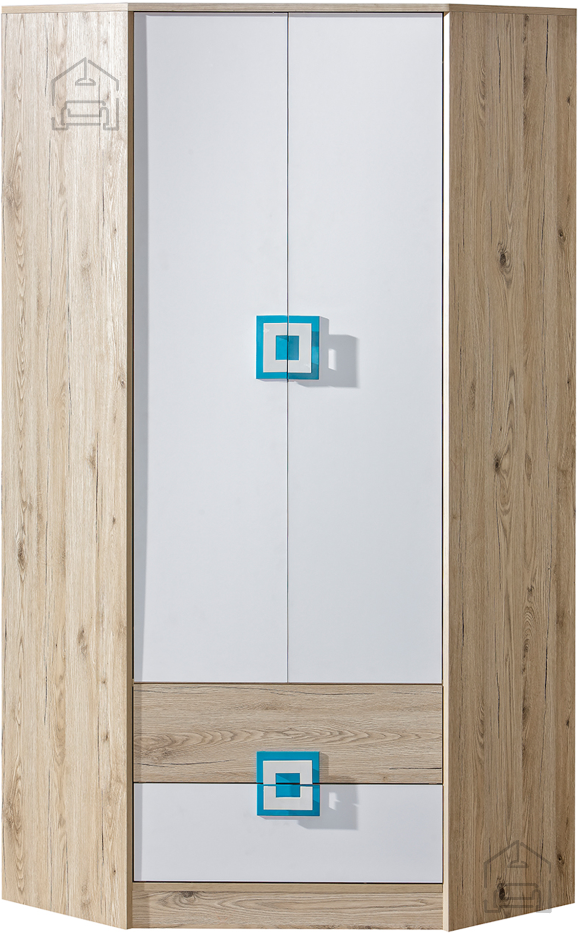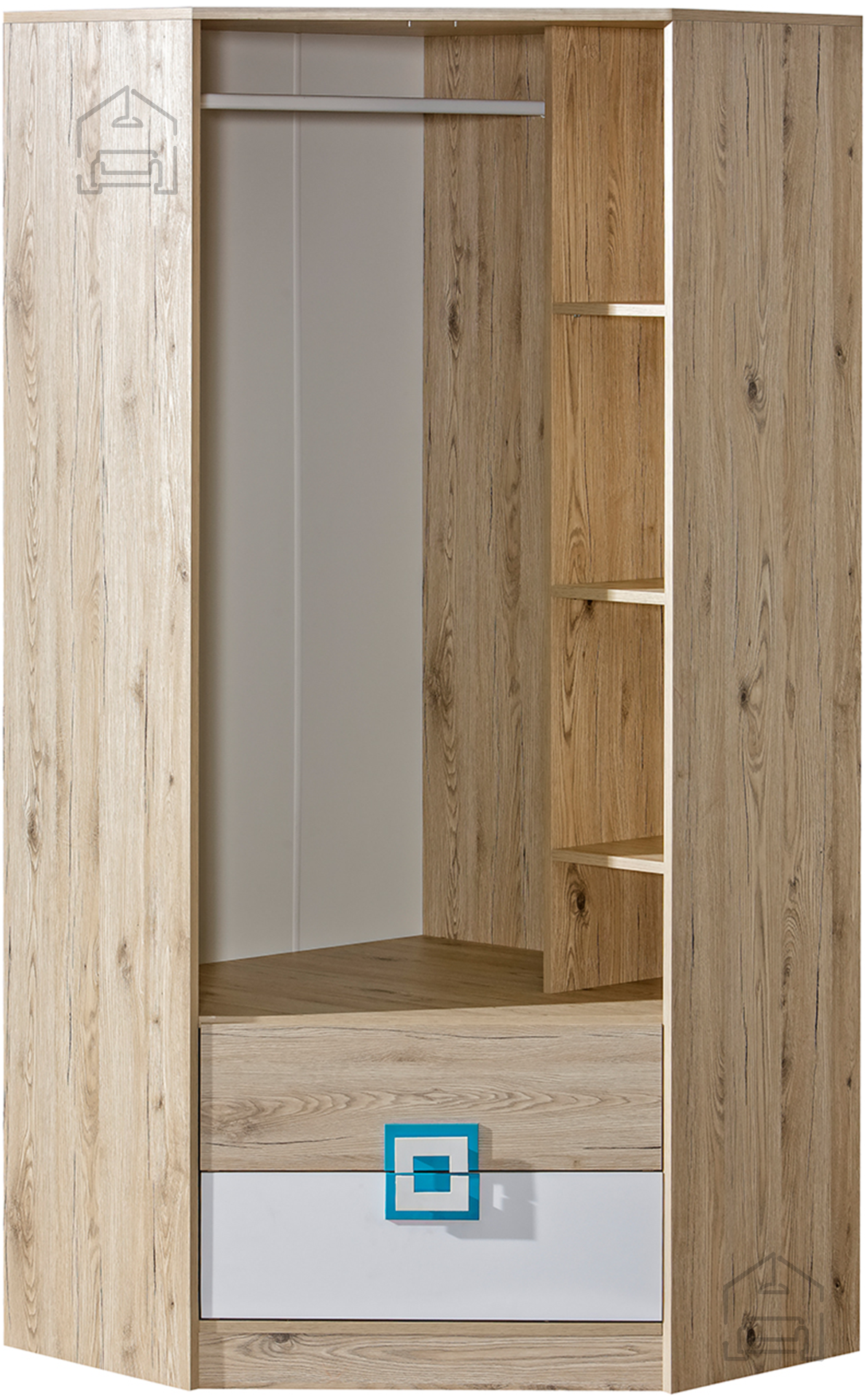 Kotna garderobna omara Nico 2 – hrast/turkizna je praktična rešitev za vsak dom, kjer sta pomembna tako prostorska učinkovitost kot estetski videz. Izdelana je iz kakovostne iverne laminirane plošče debeline 16 mm, ki zagotavlja stabilnost, dolgo življenjsko dobo in enostavno čiščenje. Kombinacija svetlega hrasta in bele barve s turkiznimi poudarki na ročajih prinaša sodoben, svež videz, ki se lepo ujema z različnimi notranjimi slogi – od skandinavskega do minimalističnega.