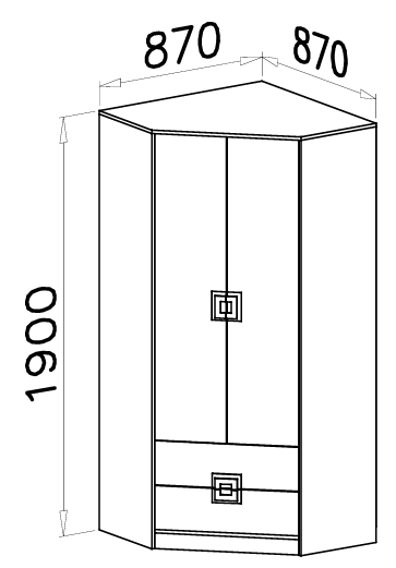 Omara je zasnovana kot kotna, zato optimalno izkoristi prostor v sobi. S svojimi merami 87x87x190 cm nudi prostorno notranjost, hkrati pa ne zavzame preveč talne površine. Ta oblika je idealna za manjše sobe, otroške sobe ali predsobe, kjer je vsak centimeter dragocen. Postavitev omare v kot omogoča naravni prehod med stenama in ustvarja občutek urejenosti ter prostornosti.