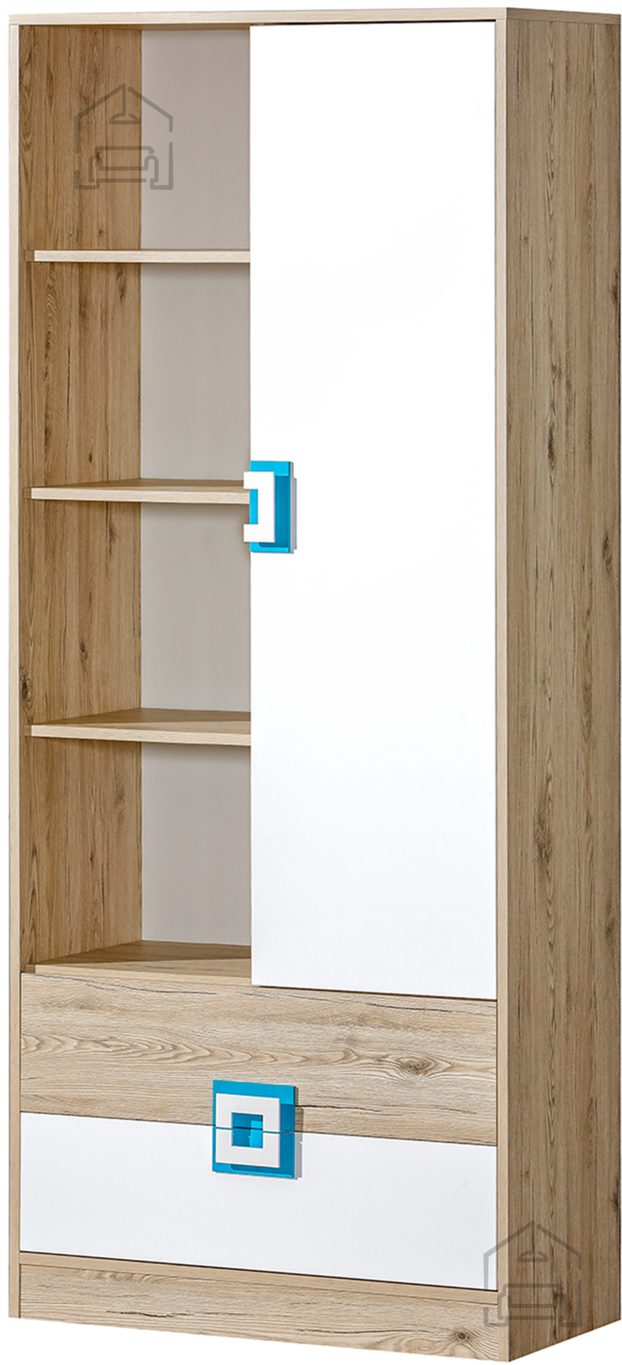 Osnovna barva regala je svetli hrast, ki v prostor vnese toplino in občutek naravnosti. Bela in turkizna barva ročajev pa ustvarjata prijeten kontrast, zaradi katerega regal izstopa, ne da bi bil vsiljiv. Ta barvna kombinacija se lepo poda tako k svetlemu kot k temnejšemu pohištvu, zato ga je mogoče enostavno vključiti v različne interierje. Turizni detajli predvsem v mladinskih sobah vnesejo energijo in sodoben pridih.