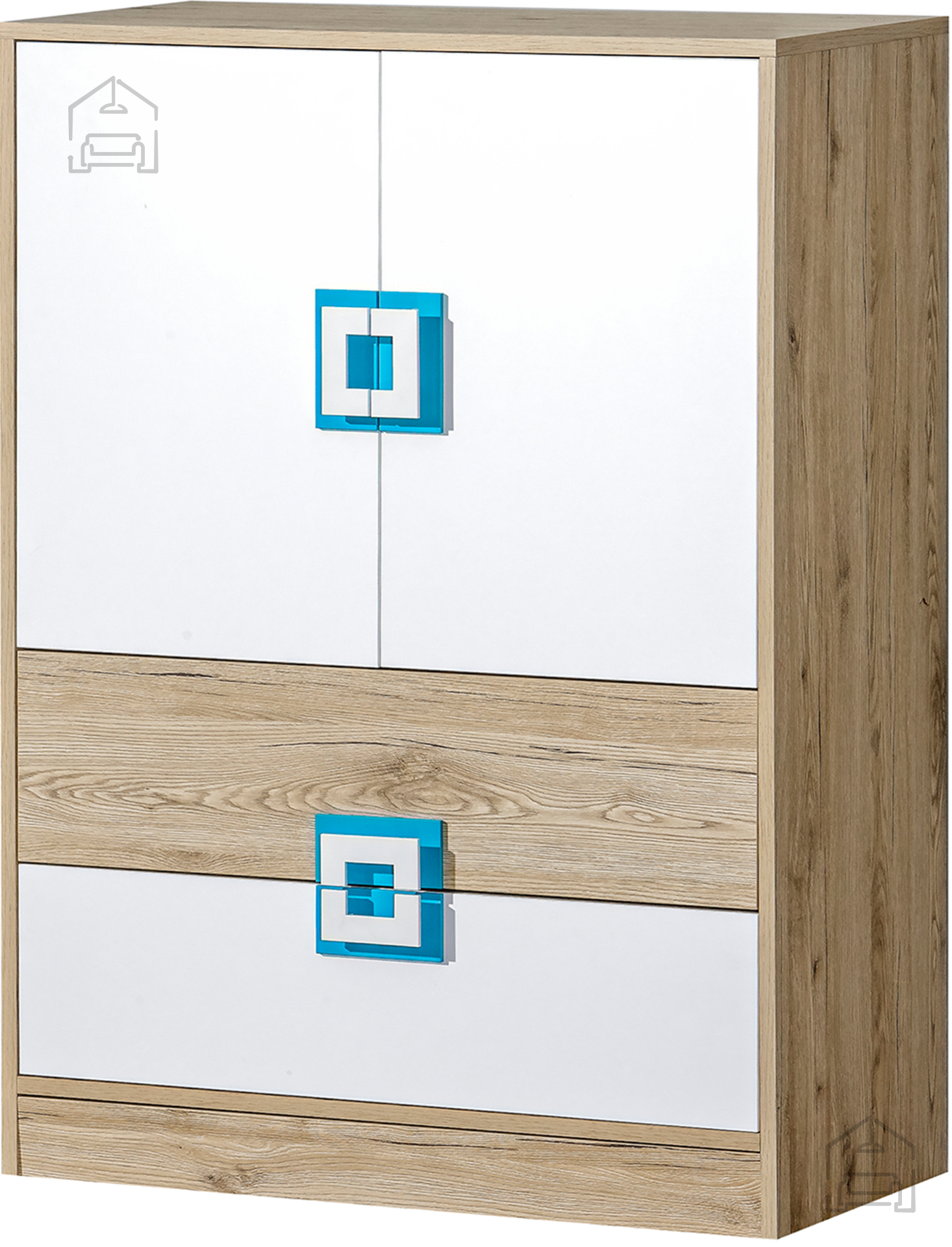 Model Nico 9 se odlično ujema z različnimi oblikovalskimi slogi – od skandinavskega do minimalističnega. Lesni dekor v kombinaciji z belo barvo poudarja naravne tone, medtem ko turkizni poudarki dodajo značaj in toplino. Komoda se lahko uporablja kot samostojen kos pohištva ali kot del večjega sestava v seriji Nico, kar omogoča enoten videz notranje opreme.
