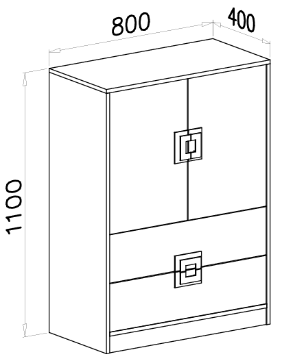 Komoda meri 80 cm v širino, 40 cm v globino in 110 cm v višino. Te mere omogočajo enostavno postavitev tudi v manjših prostorih, hkrati pa ponujajo dovolj prostora za shranjevanje. Višja oblika komode izkorišča vertikalni prostor in tako olajša organizacijo predmetov. Notranjost je zasnovana za pregledno razporeditev oblačil, dokumentov ali drugih osebnih stvari, kar prispeva k urejenemu videzu prostora.