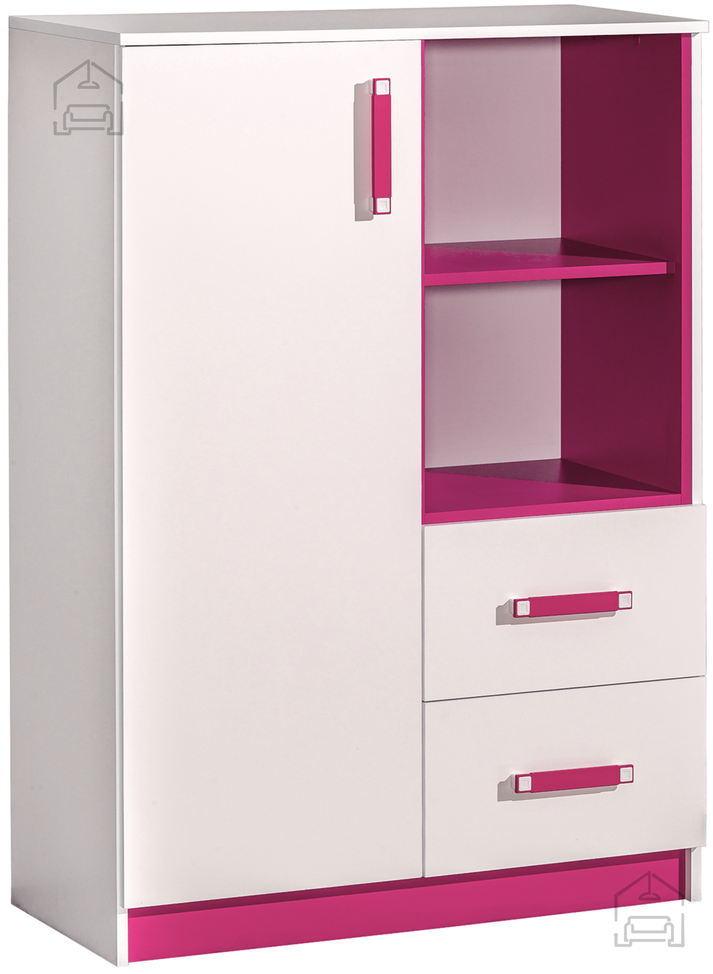 Visoka komoda Trafiko 6 združuje sodoben dizajn, funkcionalnost in kakovostno izdelavo. Zaradi premišljenega razmerja med dimenzijami in prostornino je primerna za različne prostore doma, od mladinskih sob do spalnic in predsobi. Kombinacija bele in roza barve, trpežni materiali ter natančna obdelava robov so značilnosti, ki komodo uvrščajo med zanesljive in estetsko dovršene pohištvene rešitve za vsakdanjo uporabo.