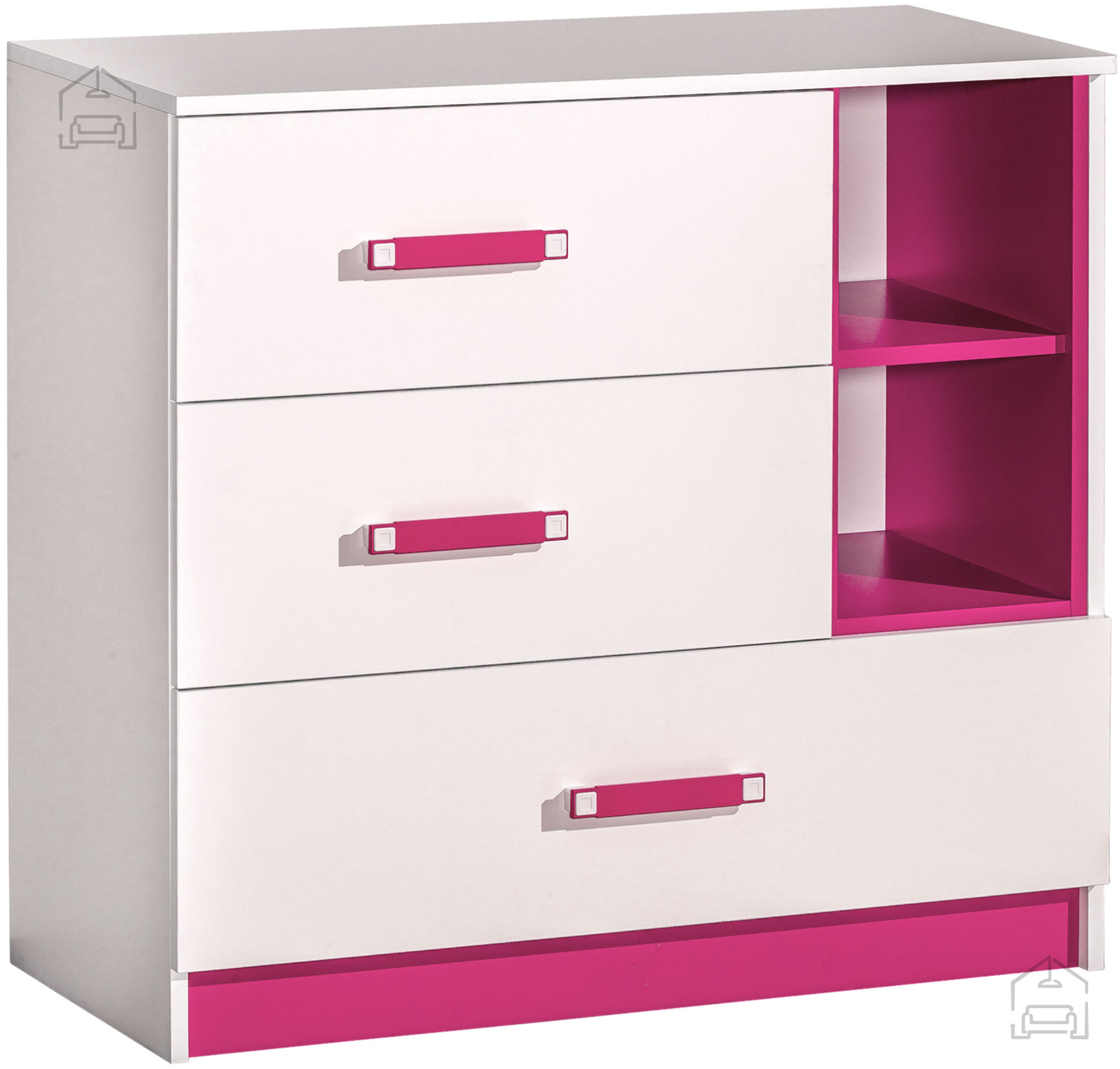 Izdelek odlikuje skrbno izbrana barvna kombinacija – osnovni del komode je v beli barvi, medtem ko dekorativni poudarki in ročaji v rožnati barvi ustvarjajo prijeten kontrast. Ročaji so izdelani iz trpežnega sintetičnega materiala, ki je prijeten na dotik in omogoča udobno uporabo. Ta barvna kombinacija je priljubljena izbira pri tistih, ki želijo prostoru dodati nežnost, toplino in pridih igrivosti.