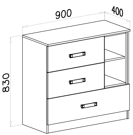 Komoda je zasnovana tako, da nudi veliko prostora za shranjevanje, ne da bi zavzela preveč talne površine. V notranjosti so police, ki omogočajo pregledno razporeditev predmetov, dokumentov, tekstila ali drugih gospodinjskih potrebščin. Vodila v policah delujejo na krogličnih ležajih, kar zagotavlja gladko in tiho odpiranje ter zapiranje, hkrati pa pripomore k dolgotrajni uporabnosti pohištva. Sivi ročaji iz sintetičnega materiala so prijetni na otip in dopolnjujejo moderni videz komode.