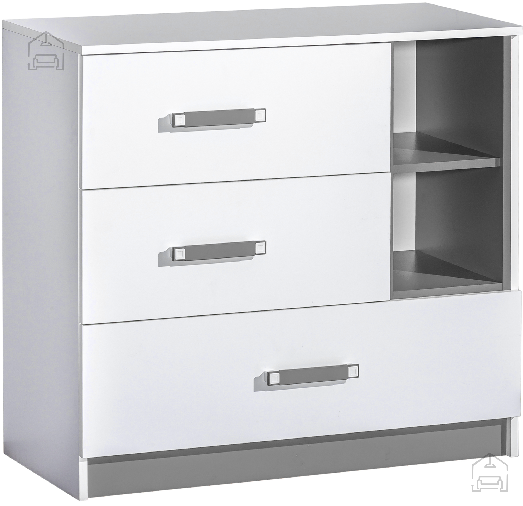 Osnovni material, iz katerega je komoda izdelana, je laminirana iverna plošča debeline 16 mm. Površina je odporna proti vsakodnevnim obremenitvam, enostavna za čiščenje in ohranja lep videz tudi po več letih uporabe. Vsi robovi so zaščiteni z ABS trakom debeline 0,5 mm, kar dodatno povečuje odpornost proti udarcem in vlagi ter preprečuje krušenje robov. Bela in siva barvna kombinacija ustvarja sodoben videz, ki se lepo ujema z različnimi barvnimi paletami notranjih prostorov.