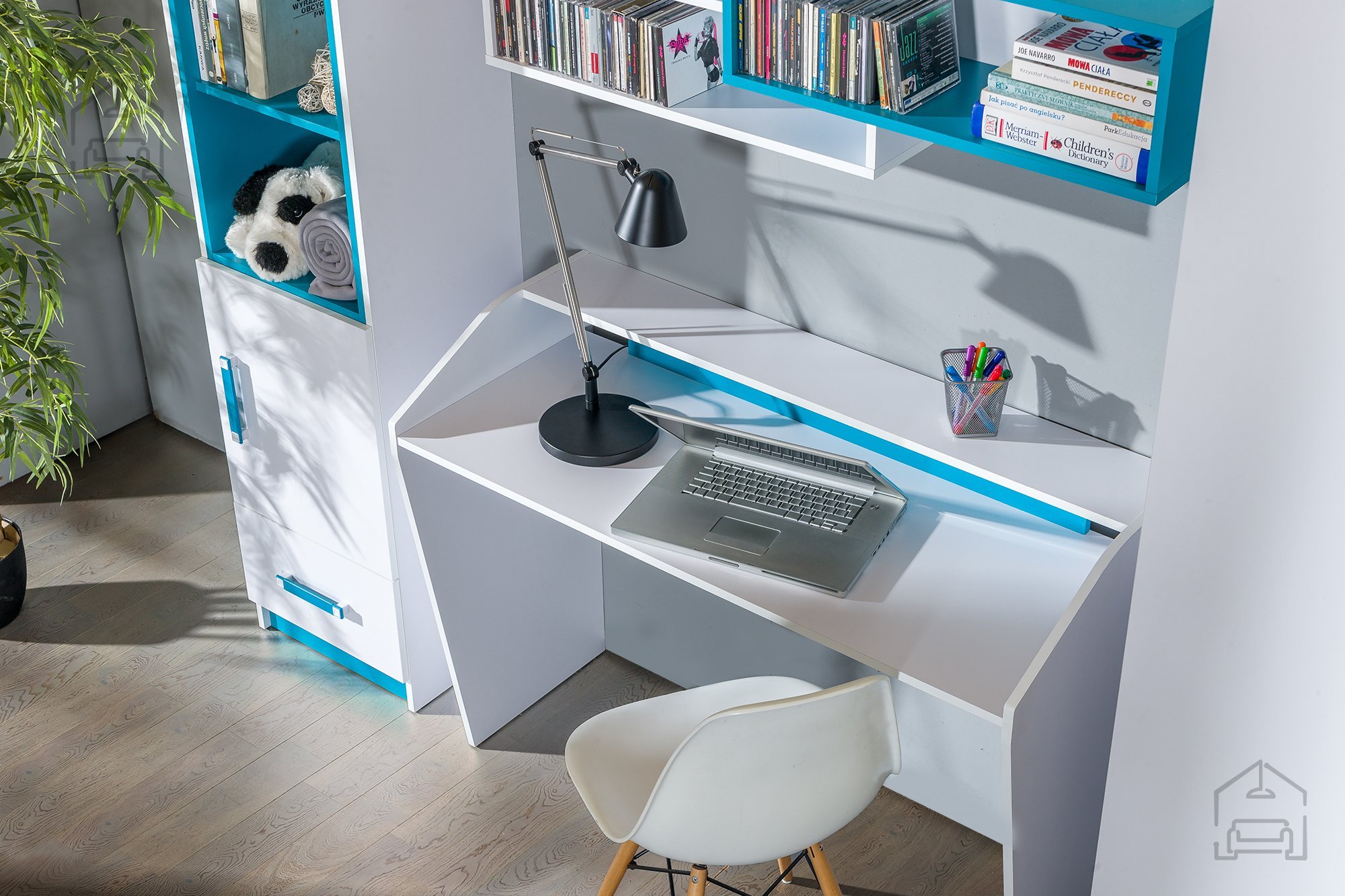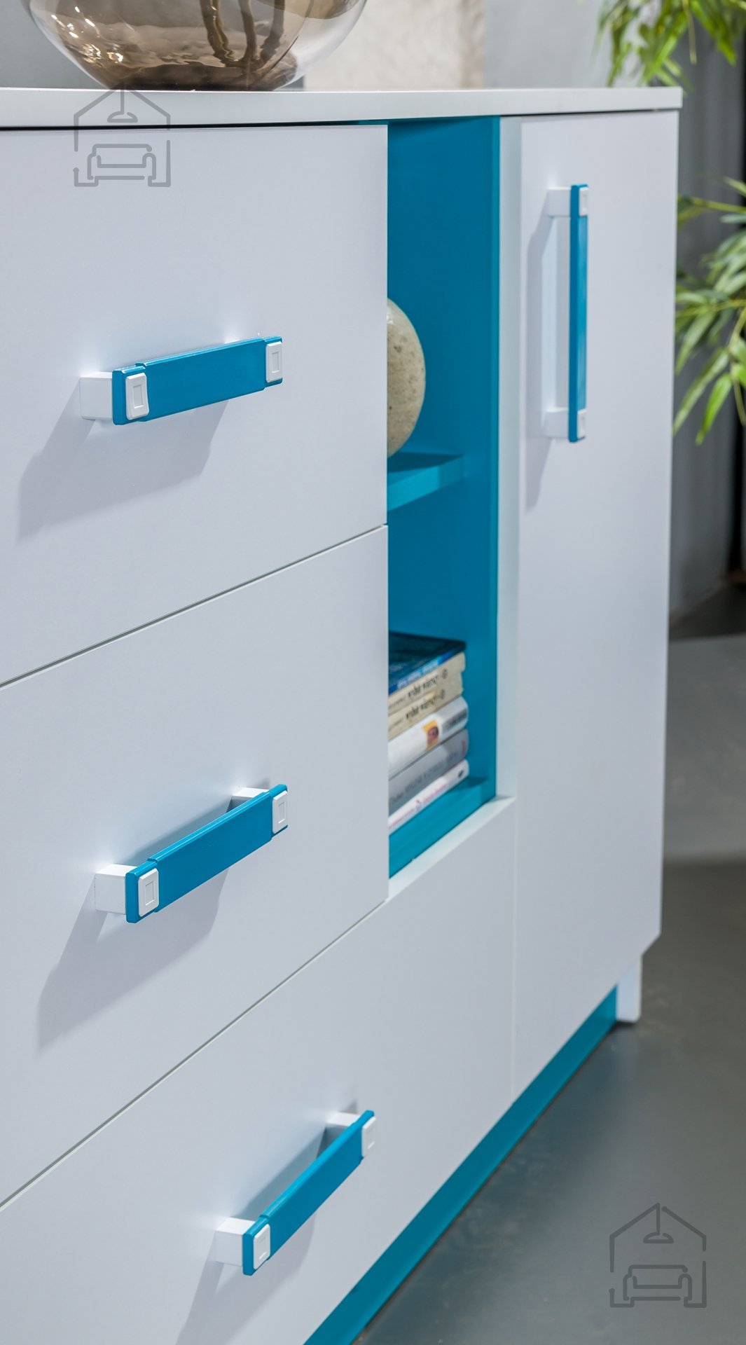 Barvna shema bele in turkizna ustvarja prijeten kontrast, ki sobi doda svetlobo in toplino. Bela barva optično poveča prostor, rožnati poudarki pa vnašajo igrivost in otroško energijo. Turkizna ročaji iz sintetičnega materiala so mehki na dotik in hkrati dovolj trpežni za vsakodnevno uporabo. Kombinacija teh elementov daje pohištvu značilen, sodoben videz, ki ga je mogoče enostavno dopolniti z različnimi dekorativnimi dodatki.