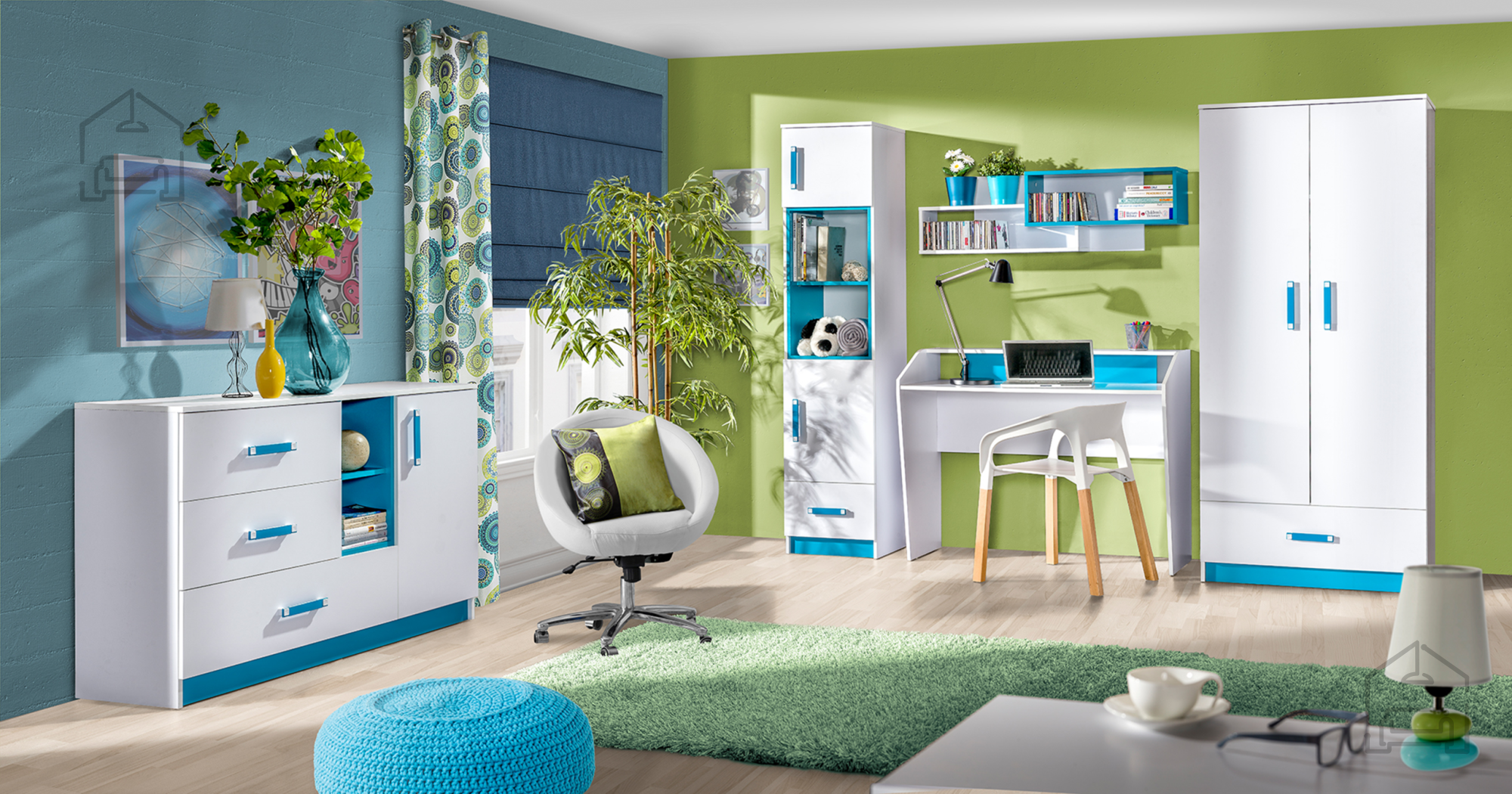Regal navduši s kontrastno, a harmonično barvno kombinacijo. Bela barva daje občutek prostornosti in čistosti, turkizni poudarki pa dodajo igriv in moderen značaj. Takšna kombinacija se odlično prilega mladostnim interierjem ali sodobnim stanovanjskim prostorom, kjer iščemo svežino in individualnost. Ročaji v turkizni barvi niso le estetski detajl, temveč tudi praktični element za udobno odpiranje vrat ali predalov.
