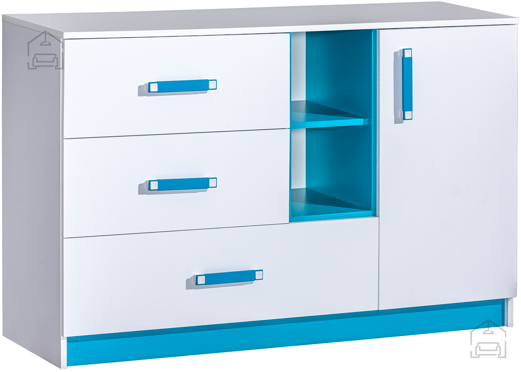 Komoda Trafiko 7 – Domel je sodoben kos pohištva, ki združuje funkcionalnost in svež dizajn. Njena kombinacija bele in turkizne barve prinaša v prostor svetlobo ter živahen poudarek, ki ga je enostavno vključiti v različne stile notranje opreme. S svojimi merami 130 × 40 × 83 cm nudi dovolj prostora za shranjevanje vsakodnevnih predmetov, oblačil ali dokumentov, hkrati pa ne zavzame preveč prostora v sobi.