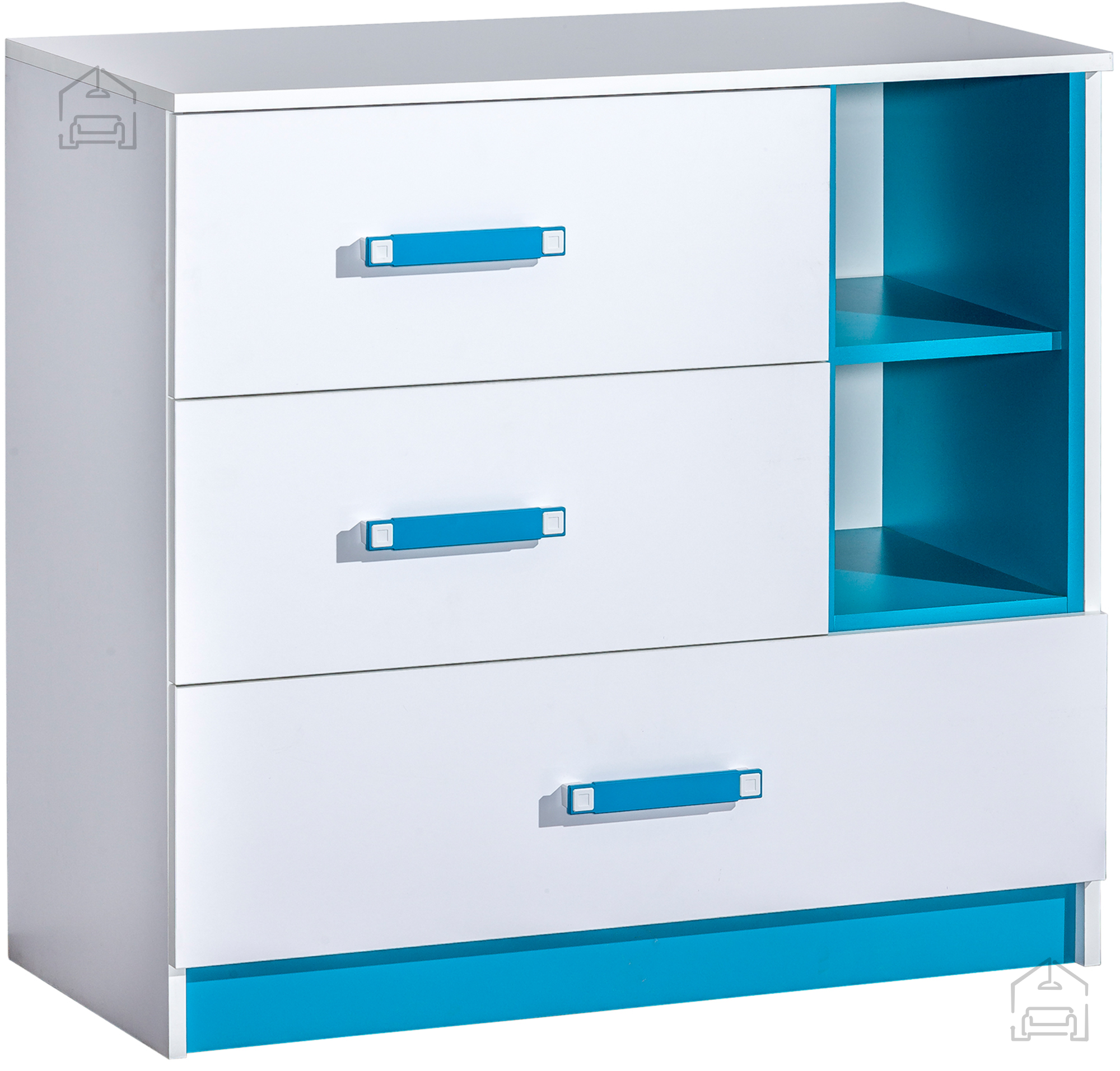 Komoda Trafiko 8 je idealna izbira za vse, ki iščejo pohištvo z ravnovesjem med praktičnostjo in estetsko dovršenostjo. Njena preprosta, a sodobna zasnova omogoča enostavno kombiniranje z drugimi barvami in materiali v prostoru. Zaradi svetlih tonov in turkiznih poudarkov se lepo poda v otroške sobe, mladinske sobe, pa tudi v sodobne dnevne prostore, kjer želite ustvariti igriv, a urejen videz. Laminirana površina je odporna na praske in vlago, zato bo komoda dolgo ohranila svoj prvotni videz.