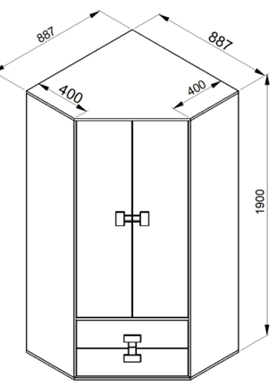 Dimenzije omare znašajo 88,7×88,7×190 cm, kar omogoča prostorno notranjost, kljub kompaktnim zunanjim meram. Kotna oblika omogoča popolno izrabo prostora v vsakem kotičku sobe, kar je še posebej uporabno v manjših stanovanjih ali prostorih, kjer je pomembna urejenost. Zaradi svoje višine se omara lepo poda tudi k višjim stropom, hkrati pa ohranja zračen videz prostora.