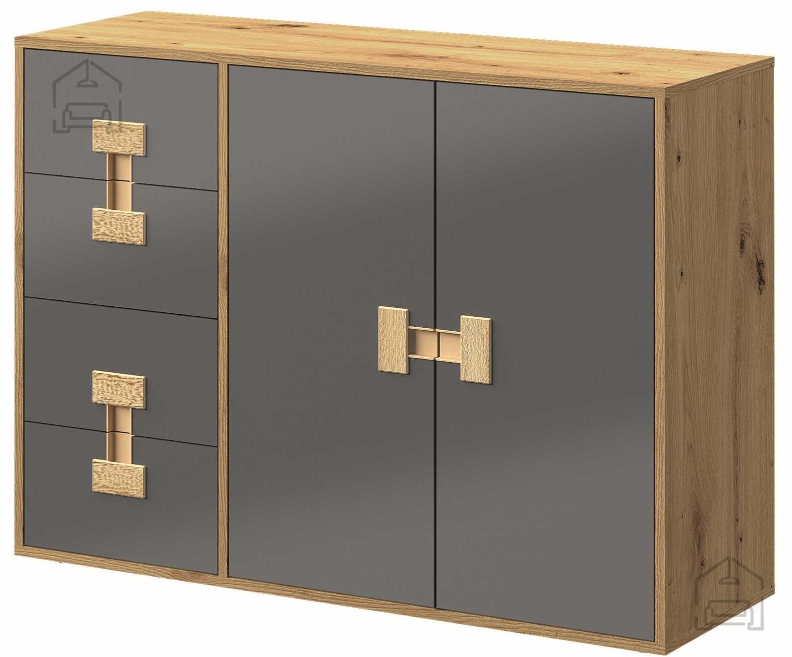 Komoda Index 08 s svojo kombinacijo sive sijajne površine in artisan hrasta sijaja deluje kot elegantna dopolnitev bivalnega prostora. Njene ravne linije in uravnotežene proporcije ustvarjajo sodoben videz, ki se zlahka vključi v obstoječo opremo. Ne glede na to, ali jo postavite v dnevno sobo, spalnico ali hodnik, bo komoda vedno delovala urejeno in prefinjeno.