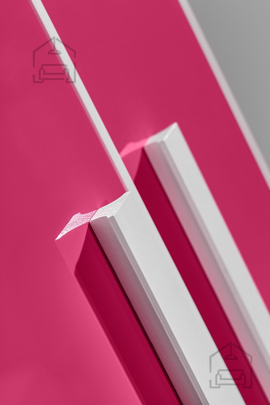 Otroška soba Guliver izstopa s svojo barvno raznolikostjo. Rožnate fronte delujejo toplo in prijetno, bele površine pa prispevajo k občutku prostornosti in svetlobe. Posebno pozornost pritegnejo ročaji v različnih barvah – beli, zeleni, rdeči, modri, vijolični in sivi. Ti barvni poudarki omogočajo igrivo kombiniranje ter spodbujajo domišljijo otrok. Takšna izbira detajlov dodaja prostoru živahen značaj, hkrati pa omogoča, da se pohištvo zlahka prilagodi drugim dekorativnim elementom v sobi.