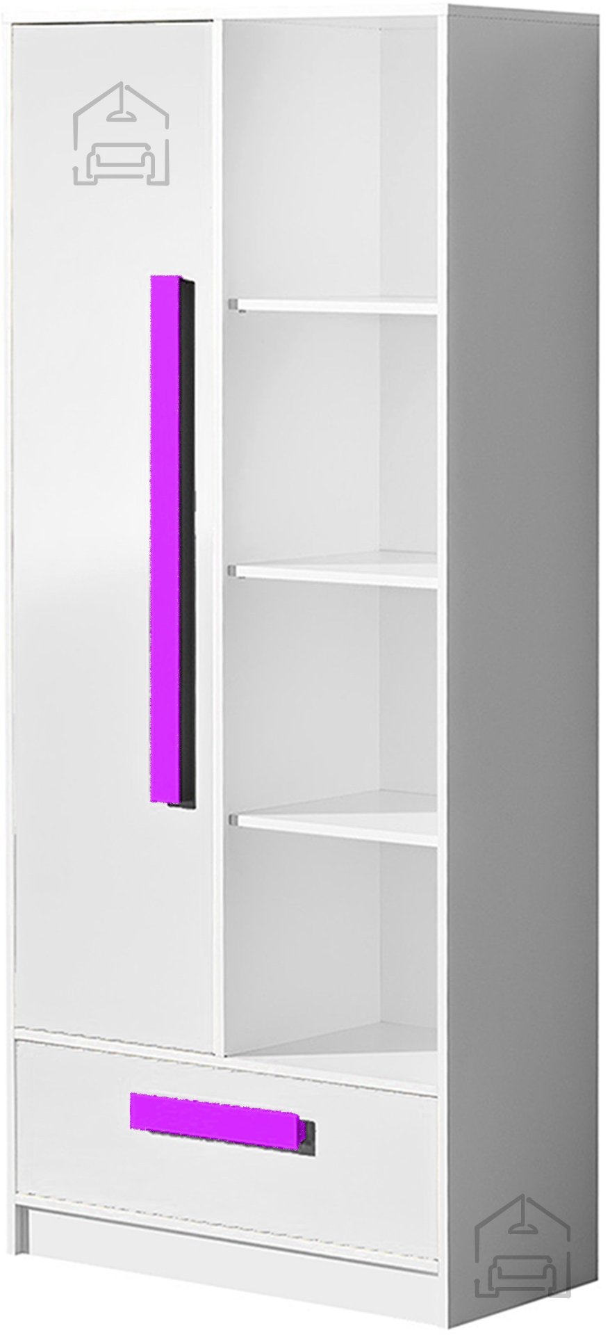 Ohišje in fronte regala sta v popolnoma beli barvi, kar ustvarja občutek zračnosti in prostora. Takšna barvna rešitev omogoča enostavno kombiniranje z drugimi pohištvenimi elementi in dekorativnimi dodatki. Poseben estetski poudarek predstavljajo ročaji, ki so na voljo v šestih različnih barvah: bela, zelena, rdeča, modra, vijolična in siva. S tem lahko uporabnik regal prilagodi svojemu okusu ali barvni shemi prostora.