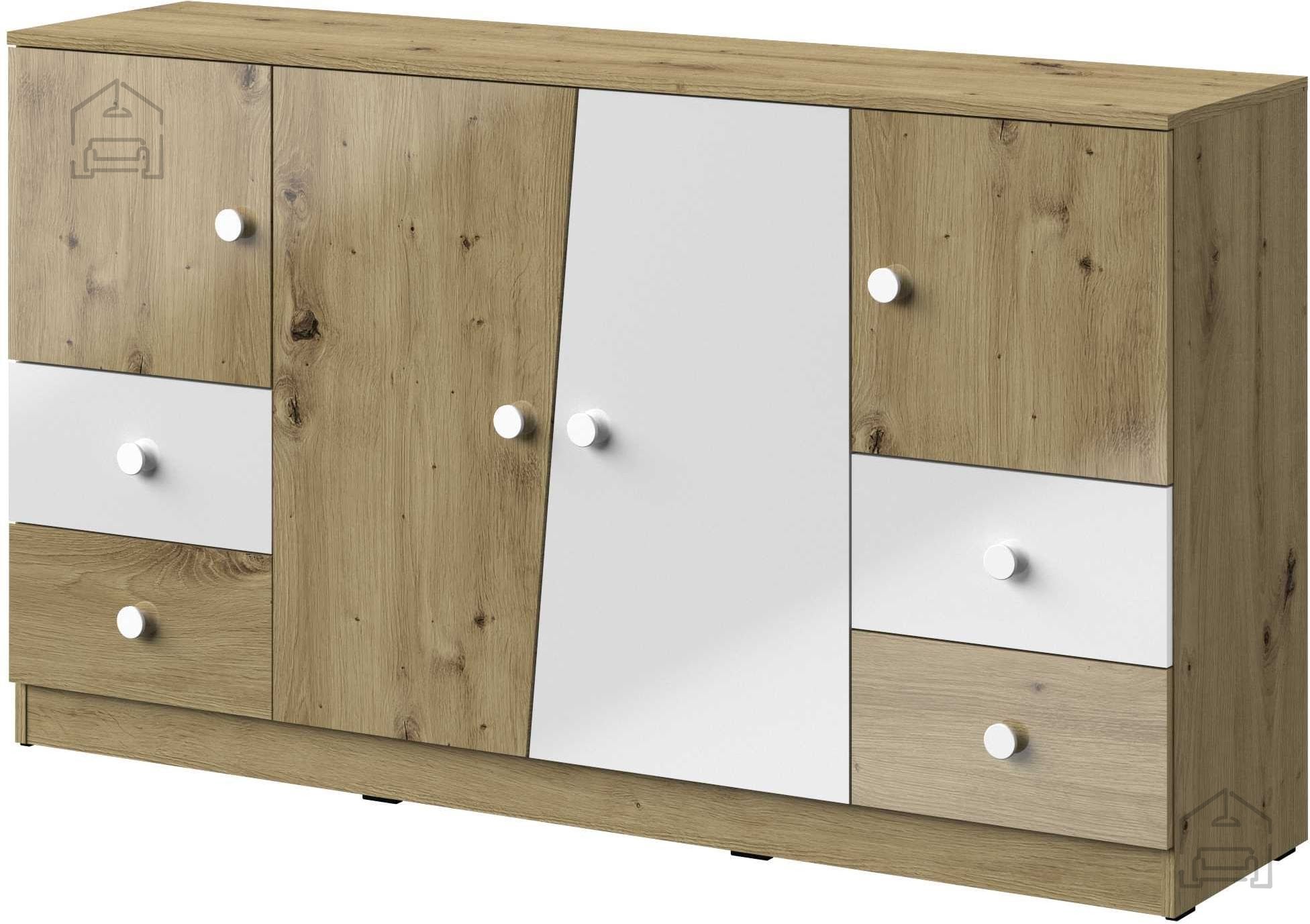 Osnova komode je izdelana iz iverne laminirane plošče debeline 16 mm, kar zagotavlja stabilnost, gladke robove in enostavno vzdrževanje. Laminirana površina je odporna proti vsakodnevnim obremenitvam, praskam in madežem, zato je komoda primerna tako za zasebne kot javne prostore. Izdelana je v tovarni Domel na Poljskem, kjer je poudarek na natančnosti obdelave in doslednosti barvnih odtenkov.