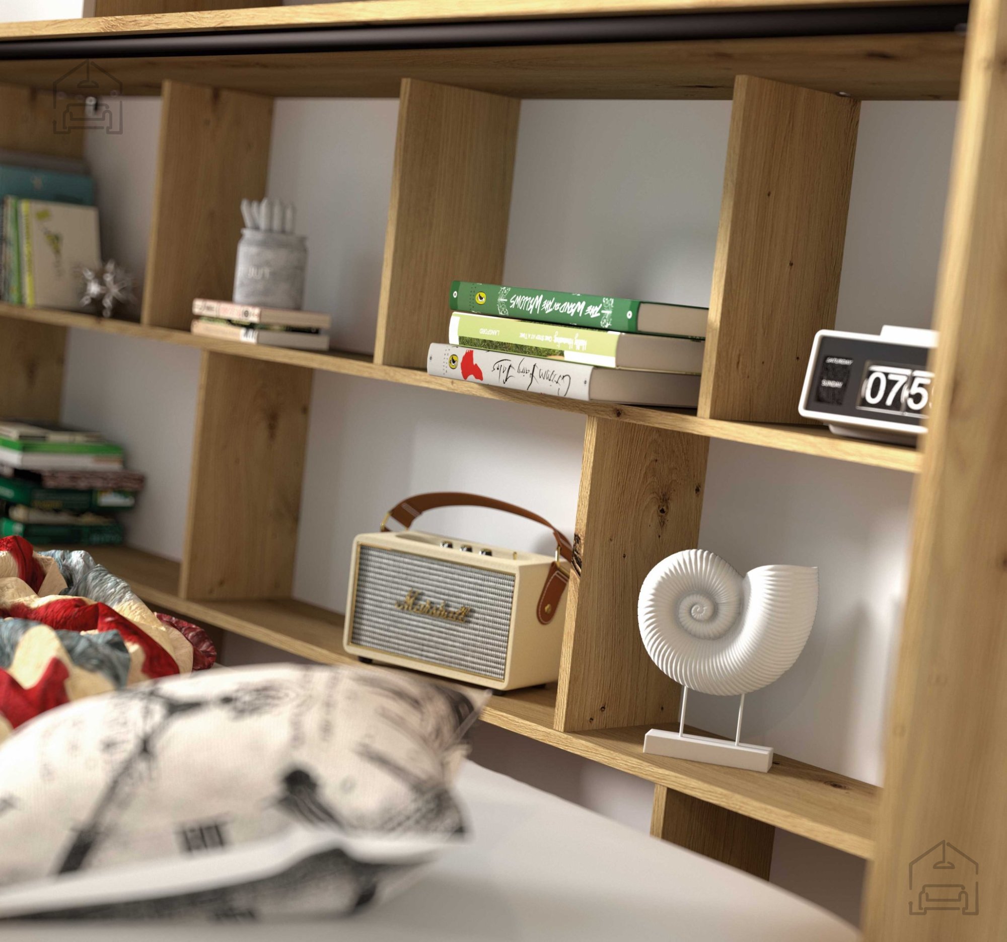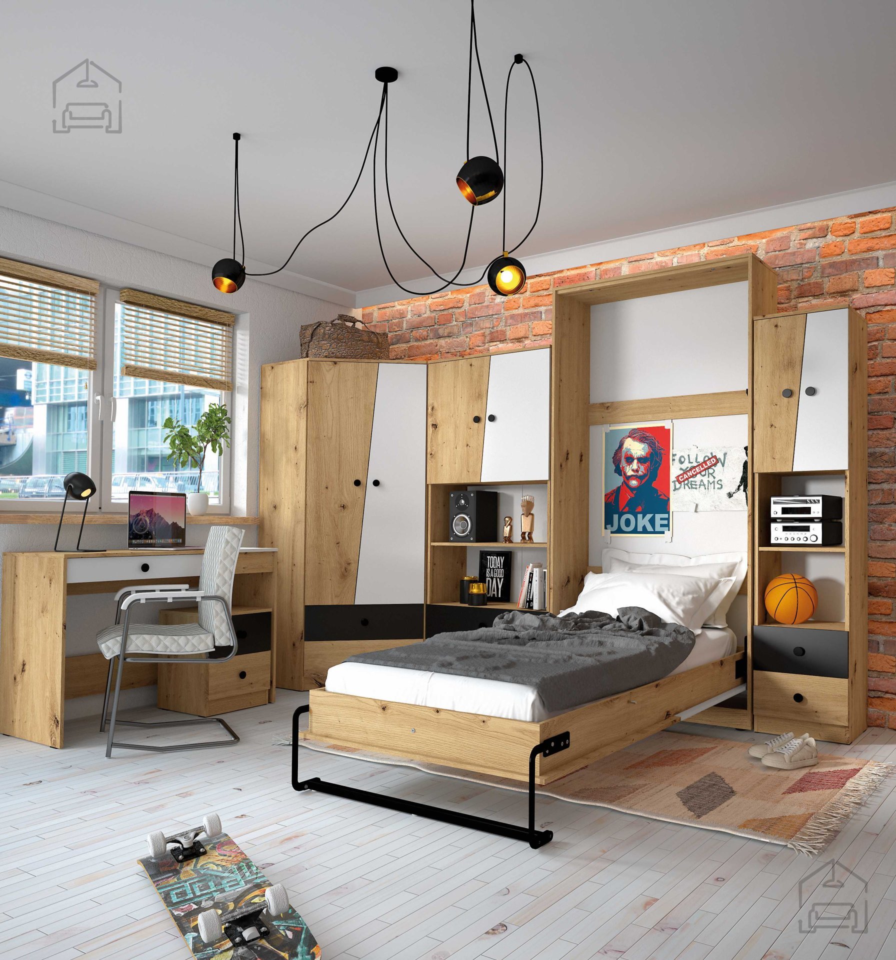 Otroška soba Nero je zasnovana tako, da omogoča optimalno izrabo prostora. Posamezni kosi pohištva – od omar in polic do pisalne mize – so logično oblikovani za enostavno razporeditev v manjših ali večjih sobah. Kombinacija odprtih in zaprtih shranjevalnih površin omogoča preglednost in urejenost, hkrati pa zagotavlja dovolj prostora za oblačila, šolske potrebščine in osebne predmete. Zaradi enotne linije elementov se lahko soba postopoma dopolnjuje glede na potrebe otroka, kar omogoča dolgotrajno uporabnost pohištva tudi v obdobju odraščanja.