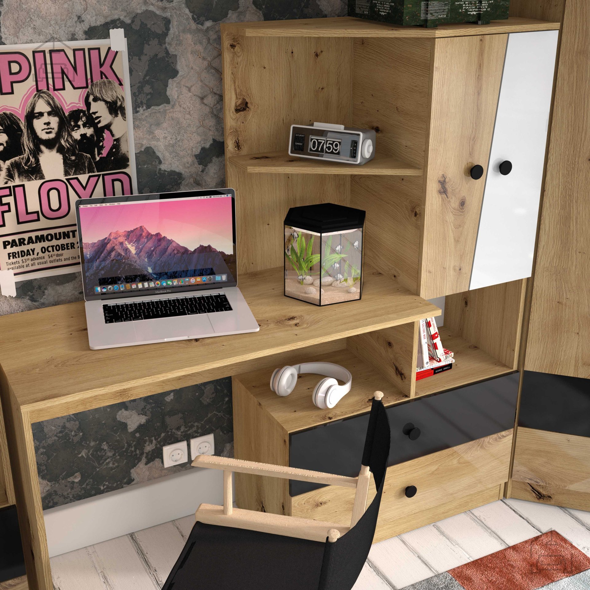 Osnova korpusa je v celoti izvedena v barvi artisan hrast, ki posnema naravno teksturo lesa in ustvarja občutek topline. Fronte so na voljo v več različicah: artisan hrast/bela mat, artisan hrast/bela/črna mat ter artisan hrast/bela/siva mat. Takšne kombinacije omogočajo, da se soba Nero harmonično zlije z različnimi notranjimi slogi – od skandinavske preprostosti do modernega urbanega izgleda. Ročaji v treh barvah – beli, črni ali sivi – dopolnjujejo izbrano barvno shemo in omogočajo subtilno personalizacijo pohištvenih elementov.