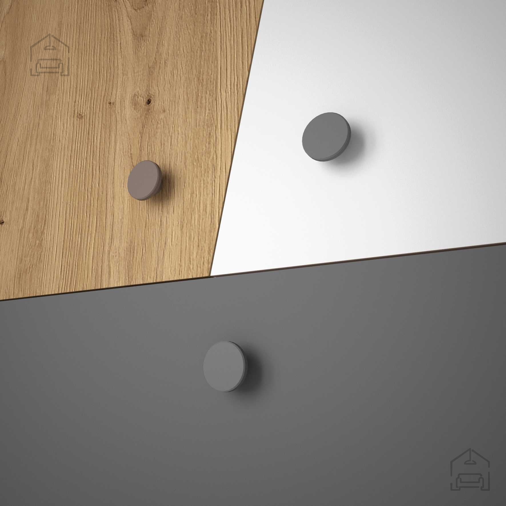 Komoda je opremljena z ročaji v treh barvnih različicah – beli, črni ali sivi. Ti detajli omogočajo subtilno prilagoditev videza glede na izbrano kombinacijo front in celoten slog prostora. Kovinski ročaji zagotavljajo prijeten oprijem in vizualno dopolnjujejo mat površine komode, kar ustvarja harmoničen, a izrazit zaključek.