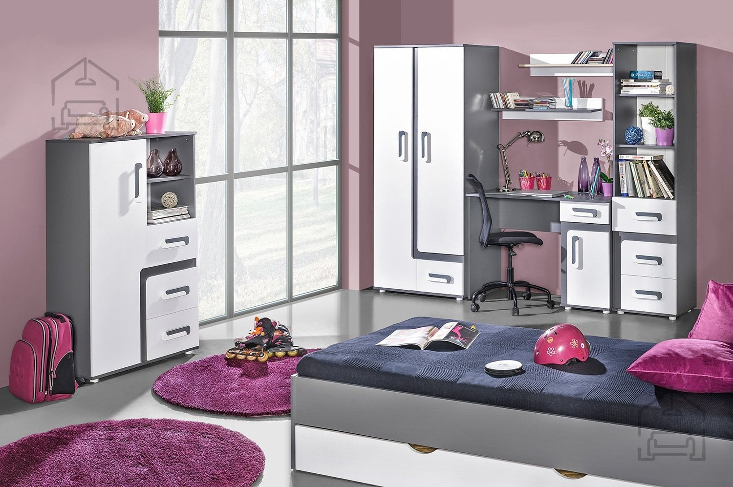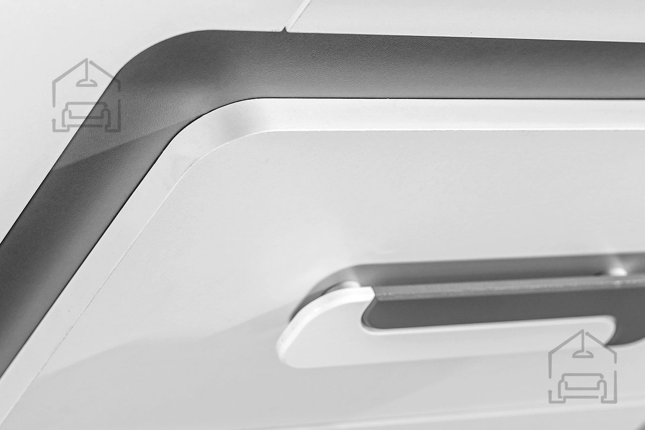Antracitna barva korpusa deluje sodobno in umirjeno, hkrati pa se zlahka kombinira z drugimi barvnimi odtenki v prostoru. Bela fronta prinaša svetlost in občutek zračnosti, kar je zlasti pomembno v manjših prostorih. Tovrstna kombinacija omogoča, da omara izstopa kot eleganten poudarek ali se harmonično zlije z obstoječim pohištvom. Ročaji v dveh tonih – beli in antracitni – so subtilen, a pomemben detajl, ki doda pridih prefinjenosti.