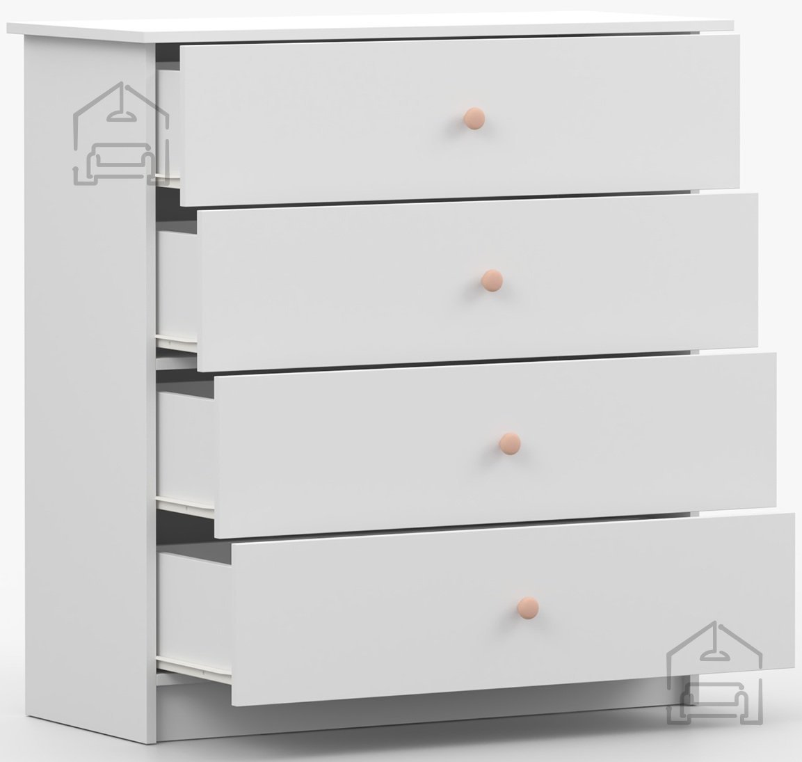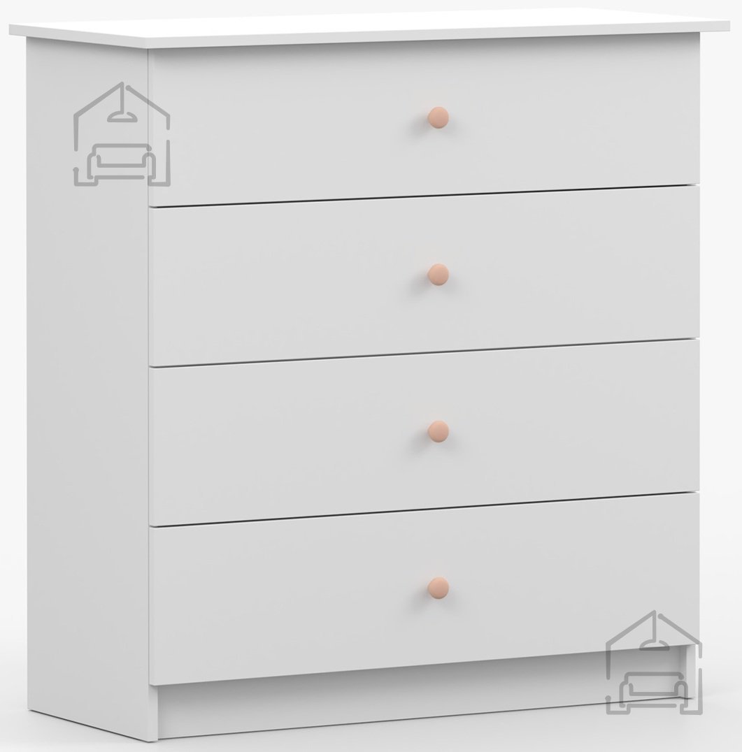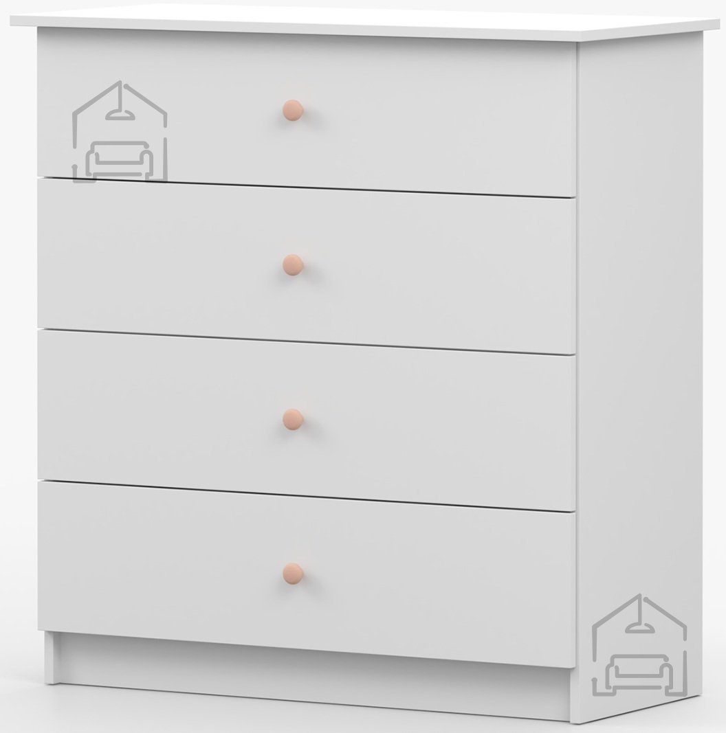 Komoda 4S Olaf je elegantna in funkcionalna rešitev za shranjevanje, namenjena sodobnim interierjem, ki cenijo preprostost, čiste linije in kakovostno izdelavo. Izdelana je iz vzdržljive laminirane plošče, ki je znana po svoji odpornosti proti obrabi, enostavnem čiščenju in dolgi življenjski dobi. Kombinacija bele barve ohišja z ročaji v roza in antracitni barvi prinaša svež, mladosten kontrast, ki se lepo poda v različne prostore – od spalnice in otroške sobe do predsobe ali dnevnega kotička.