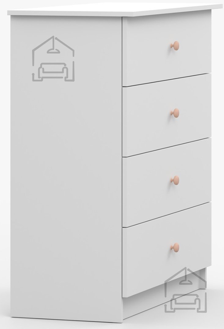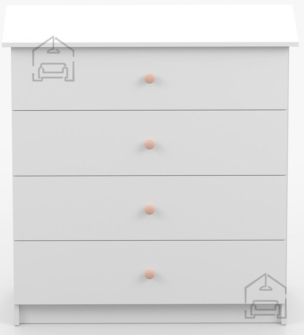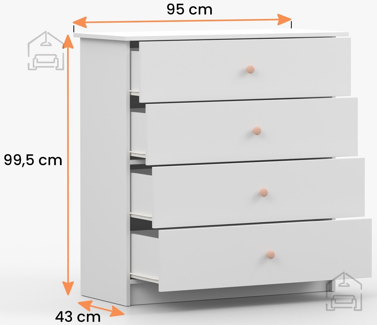 Komoda 4S Olaf je elegantna in funkcionalna rešitev za shranjevanje, namenjena sodobnim interierjem, ki cenijo preprostost, čiste linije in kakovostno izdelavo. Izdelana je iz vzdržljive laminirane plošče, ki je znana po svoji odpornosti proti obrabi, enostavnem čiščenju in dolgi življenjski dobi. Kombinacija bele barve ohišja z ročaji v roza in antracitni barvi prinaša svež, mladosten kontrast, ki se lepo poda v različne prostore – od spalnice in otroške sobe do predsobe ali dnevnega kotička.