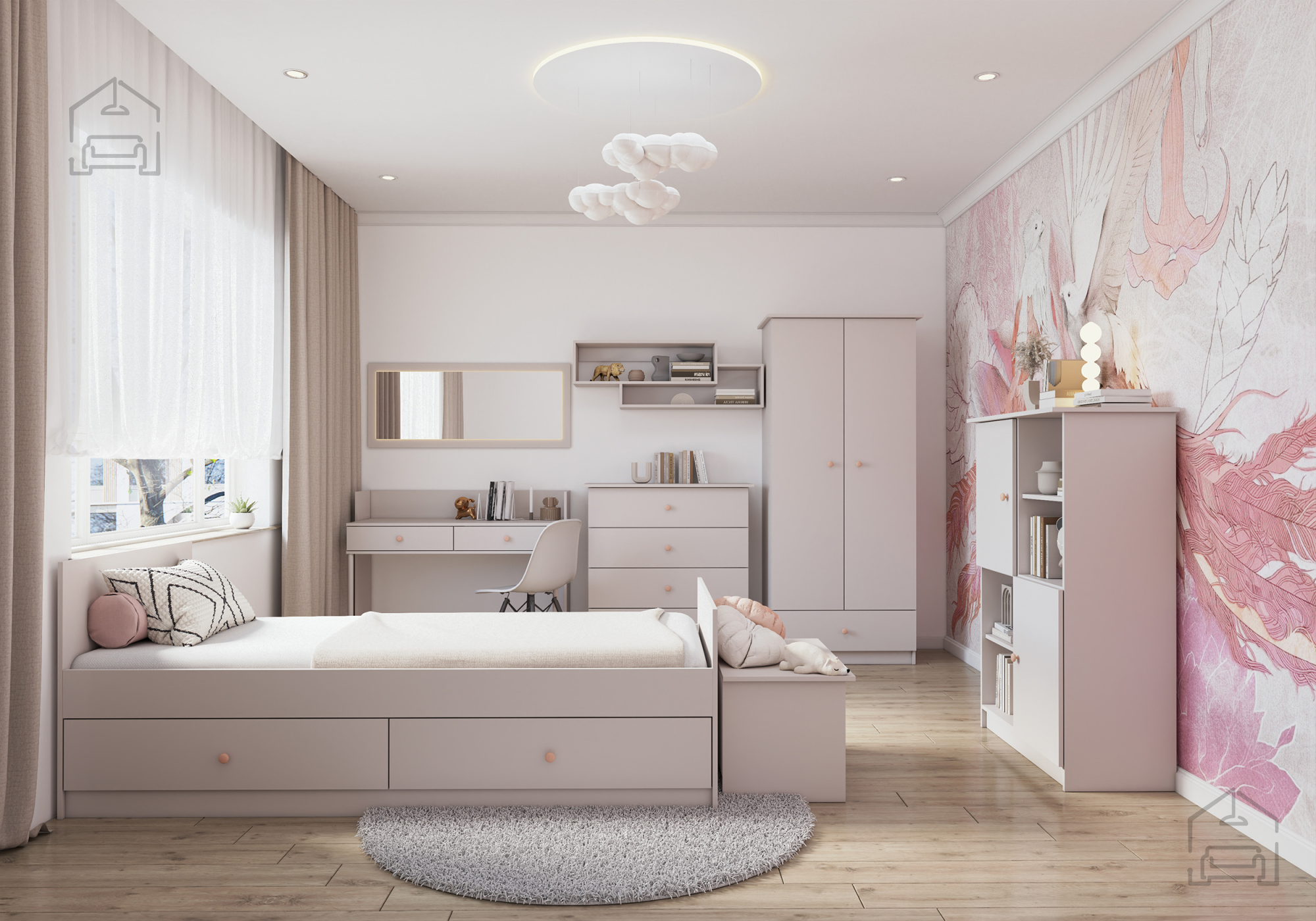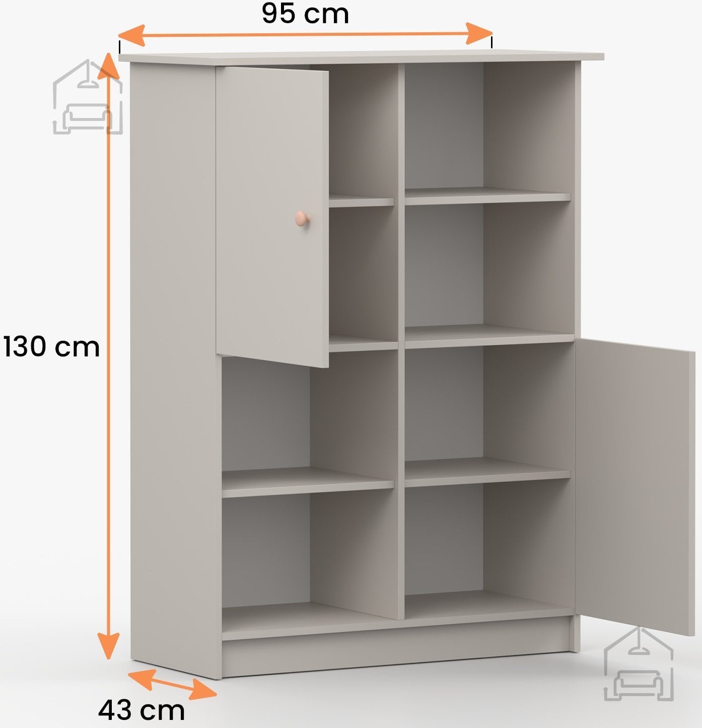 Barva kašmir prinaša v prostor občutek topline in lahkotne prefinjenosti. Gre za odtenek, ki se lepo ujema tako s svetlimi kot temnejšimi toni drugih kosov pohištva. Regal Olaf je zasnovan tako, da deluje umirjeno, a hkrati sodobno – idealna rešitev za minimalistične, skandinavske ali modernistične interierje. Ročaji v roza in antracitni barvi dodajo subtilen kontrast ter vizualno dinamiko, ki popestri enostavne linije omare.