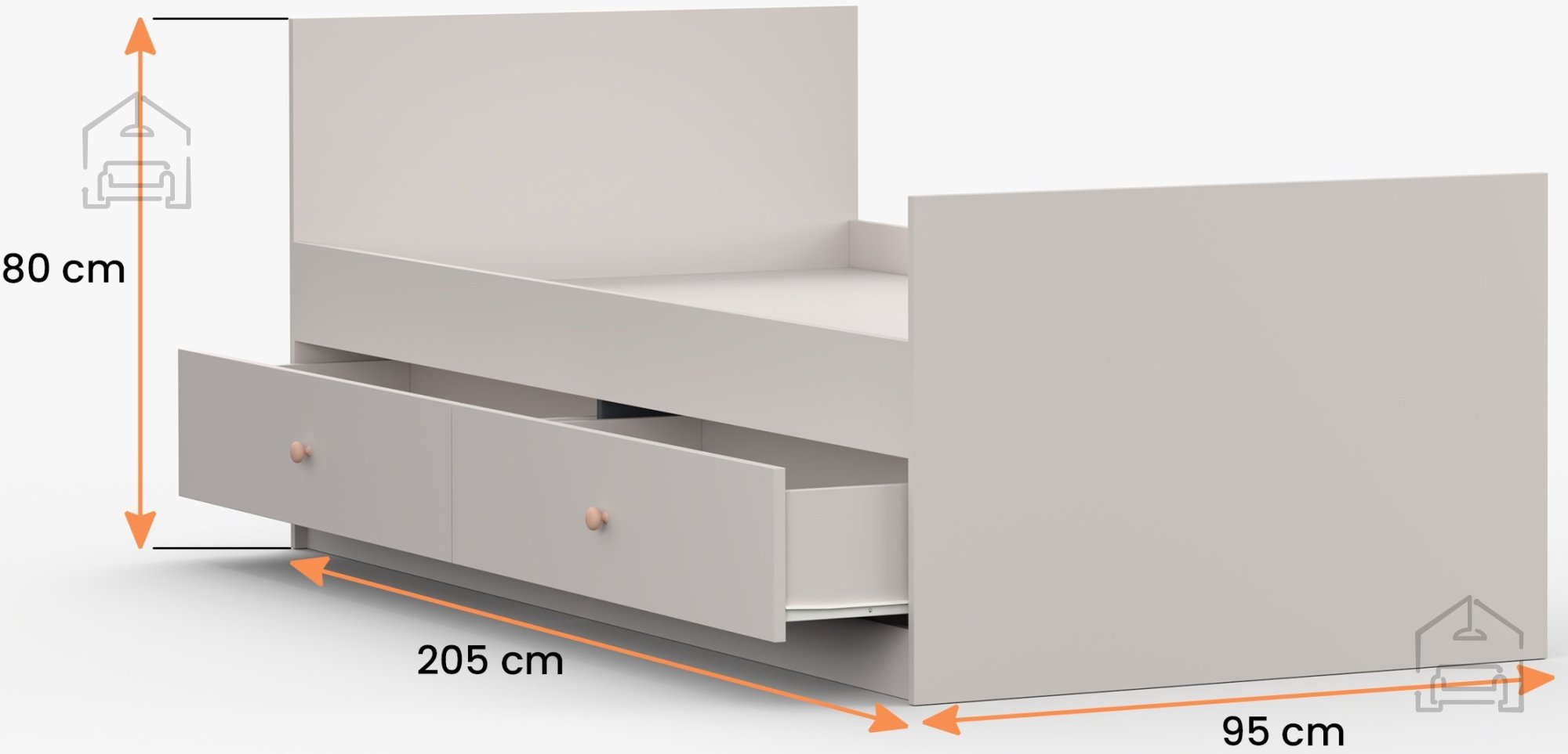 Postelja Olaf je zasnovana z mislijo na praktičnost in estetiko. Ležalna površina meri 90 x 200 cm, kar je idealno za standardne otroške vzmetnice. Celotne dimenzije izdelka so 95 x 205 x 80 cm, zato se postelja lepo prilega večini otroških sob. Izdelana je iz trpežnega iverala, ki ohranja stabilnost in odpornost proti vsakodnevni uporabi. Laminirana površina omogoča enostavno vzdrževanje – dovolj je le obris z vlažno krpo, da postelja ostane čista in sijoča.