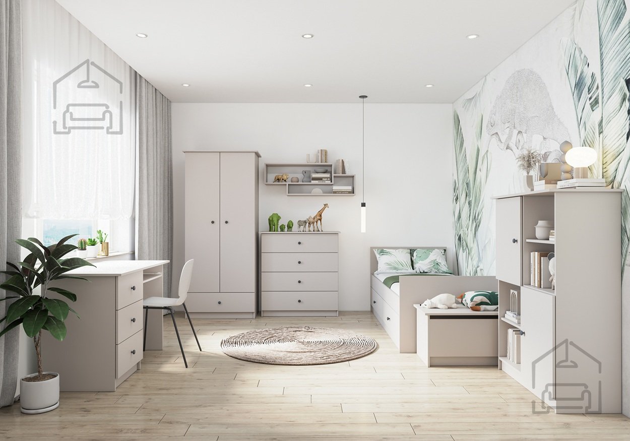 Kombinacija barve kašmir z diskretnimi ročaji v dveh tonih omogoča, da se postelja Olaf lepo ujema z različnimi stili notranje opreme – od pastelnih otroških sob do bolj minimalističnih najstniških kotičkov. Zaradi nevtralne barvne palete lahko pohištvo brez težav dopolnite z dodatki v živahnejših barvah, ki jih otrok izbere po svojih željah. Takšna prilagodljivost pomeni, da bo postelja služila več let in se prilagajala spreminjajočim se okusom ter potrebam otroka.