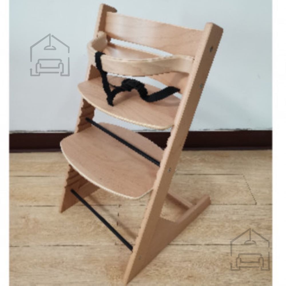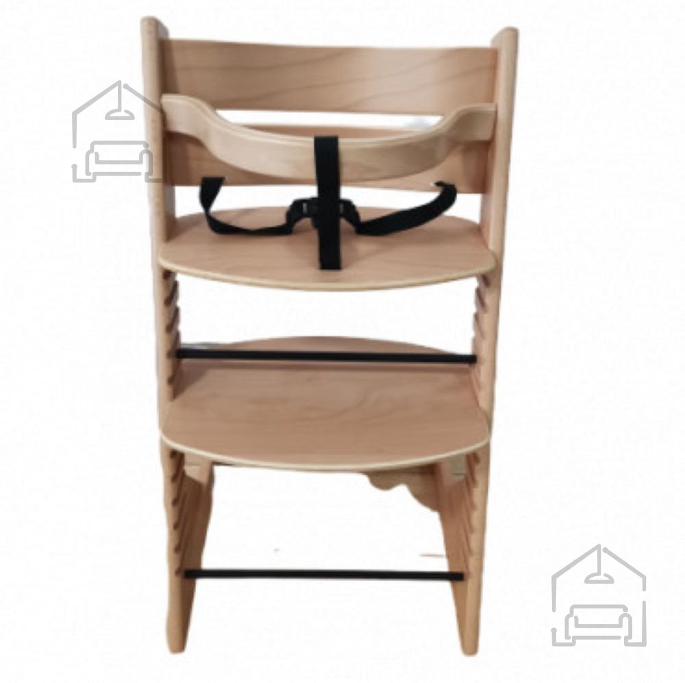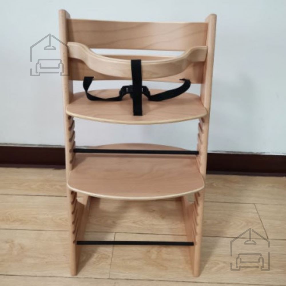 Za dodatno varnost otroka stol vključuje zaščitno leseno letev in pas iz tkanine, ki preprečujeta zdrs ali nenamerno vstajanje med uporabo. Ti elementi so nežni do otrokove kože in obenem dovolj čvrsti, da zagotavljajo stabilnost med hranjenjem ali igro. Kombinacija naravnega lesa in tekstilnega pasu ustvarja prijeten občutek topline in domačnosti, hkrati pa ohranja potrebno varnostno zanesljivost.