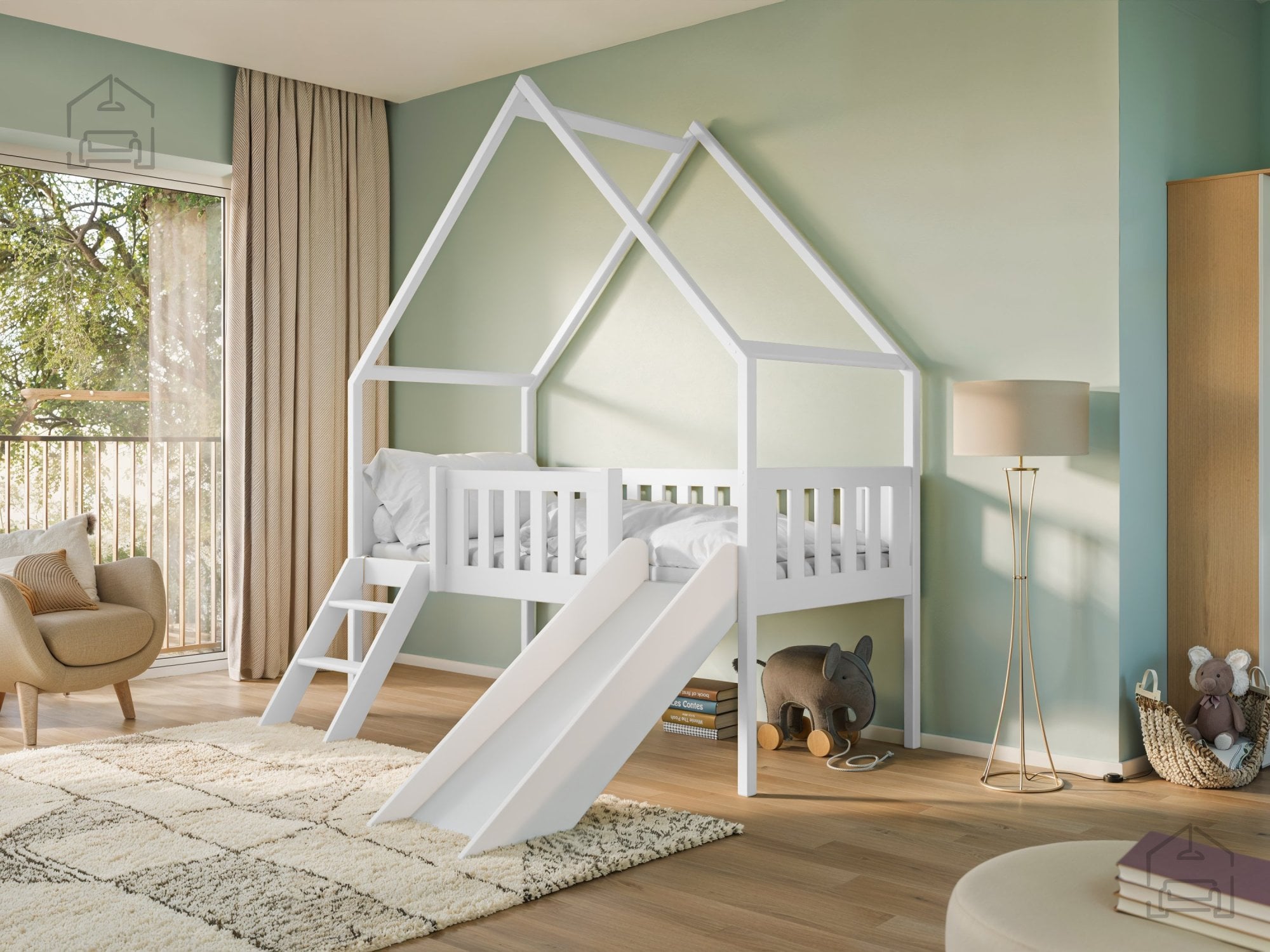 Zasnova v obliki hiške ponuja otroku občutek zasebnosti in lastnega prostora. Strešna konstrukcija omogoča dodatne možnosti dekoriranja – lahko se okrasi z lučkami, zastavicami ali tkaninami, kar ustvarja pravljično vzdušje. Tobogan ob strani postelje poskrbi za neomejeno zabavo in spodbuja gibanje, hkrati pa je zaradi premišljene postavitve varen in stabilen.