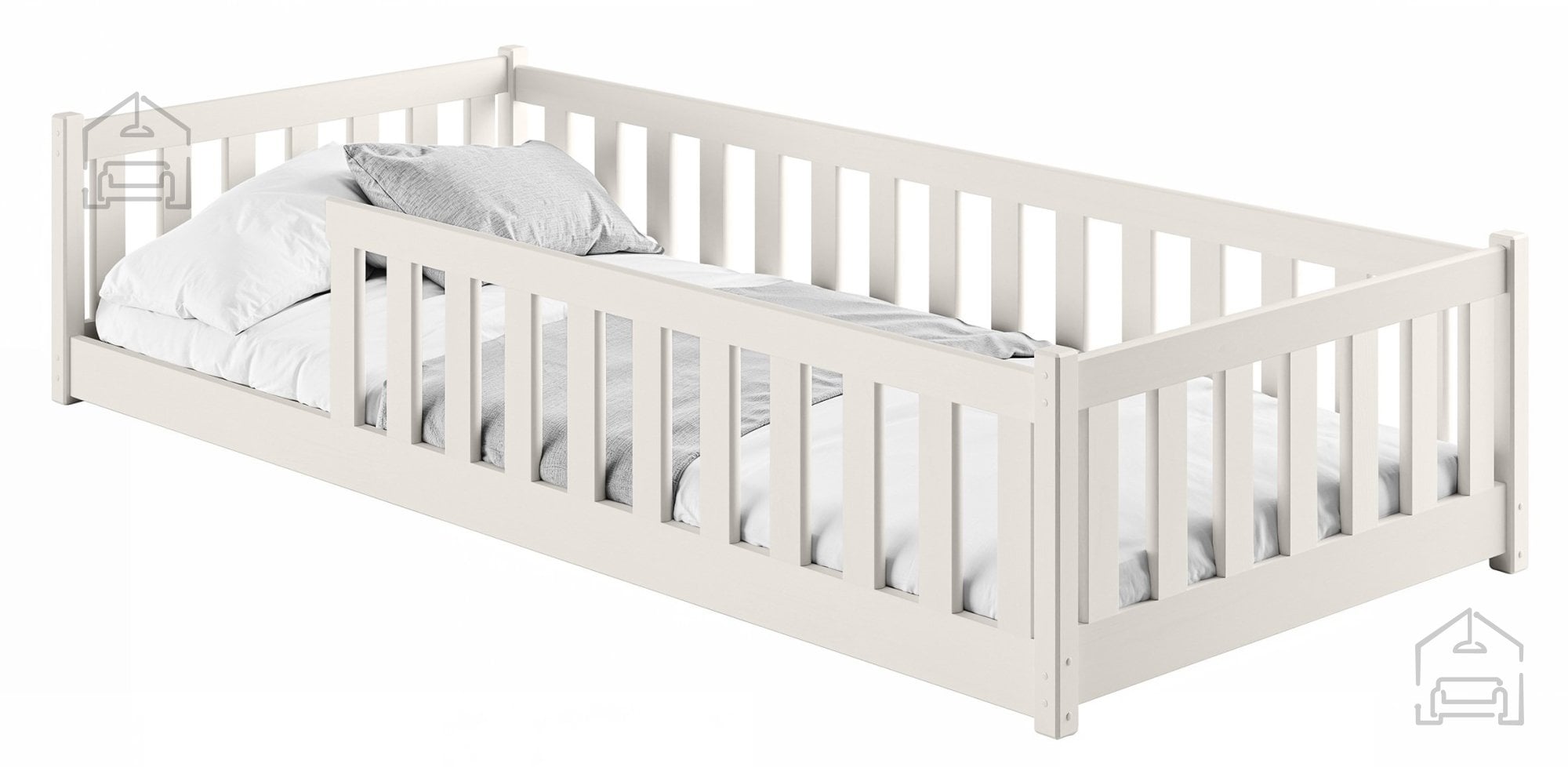 Postelja Bella je ustvarjena z mislijo na udobje in varnost otrok. Trdna konstrukcija iz borovega lesa zagotavlja stabilnost tudi pri vsakodnevni uporabi, fiksna pregrada pa preprečuje morebitne padce med spanjem. Ker je površina ležišča standardnih mer 90x200 cm, lahko enostavno izberete vzmetnico po lastni želji in tako zagotovite optimalno podporo otrokovemu telesu. Naravni les je prijeten na dotik, brez ostrih robov in premazan z varnimi premazi, primernimi za notranjo uporabo.