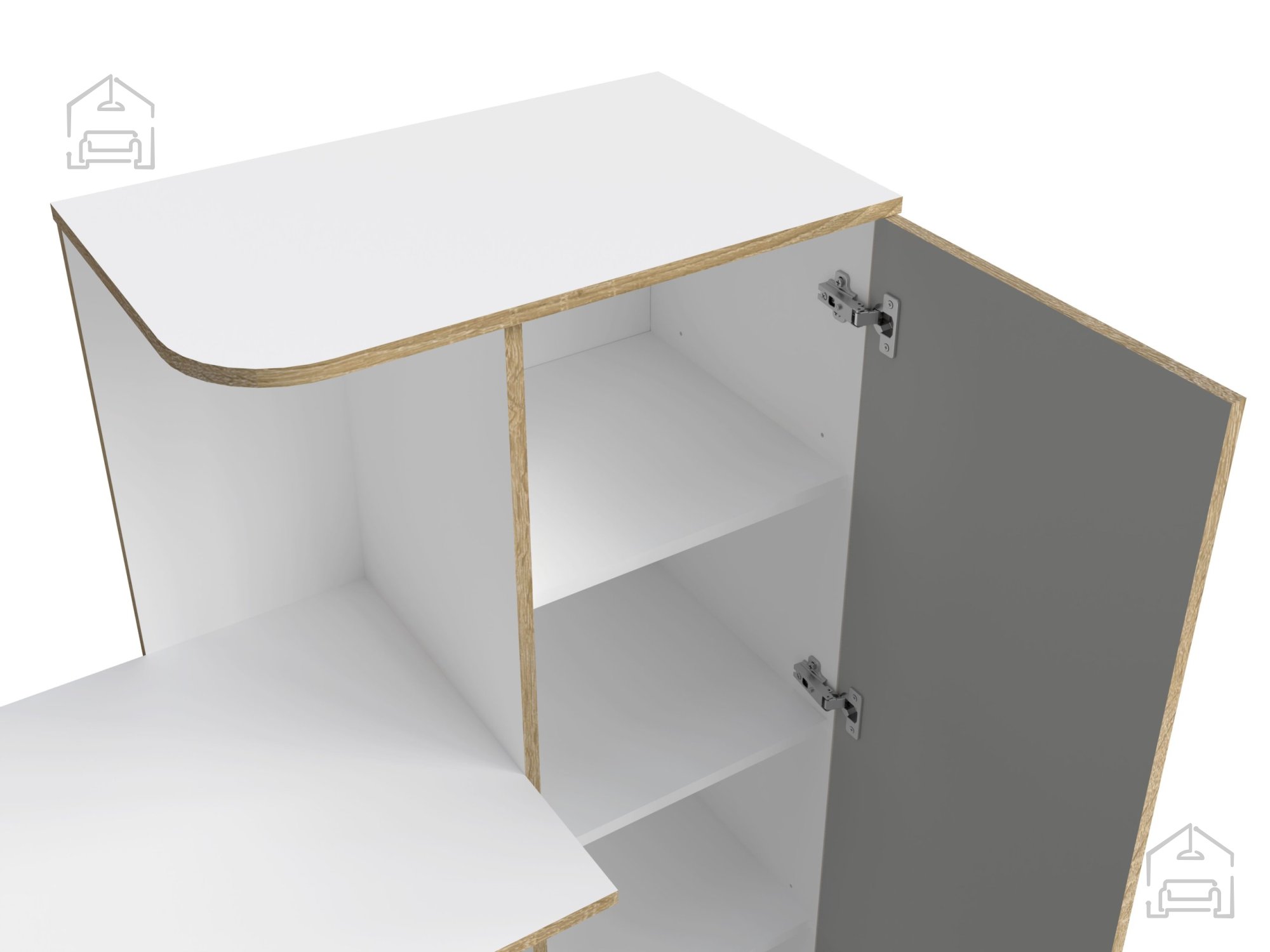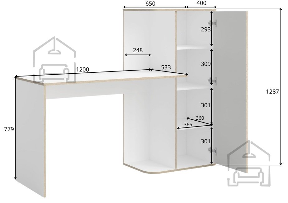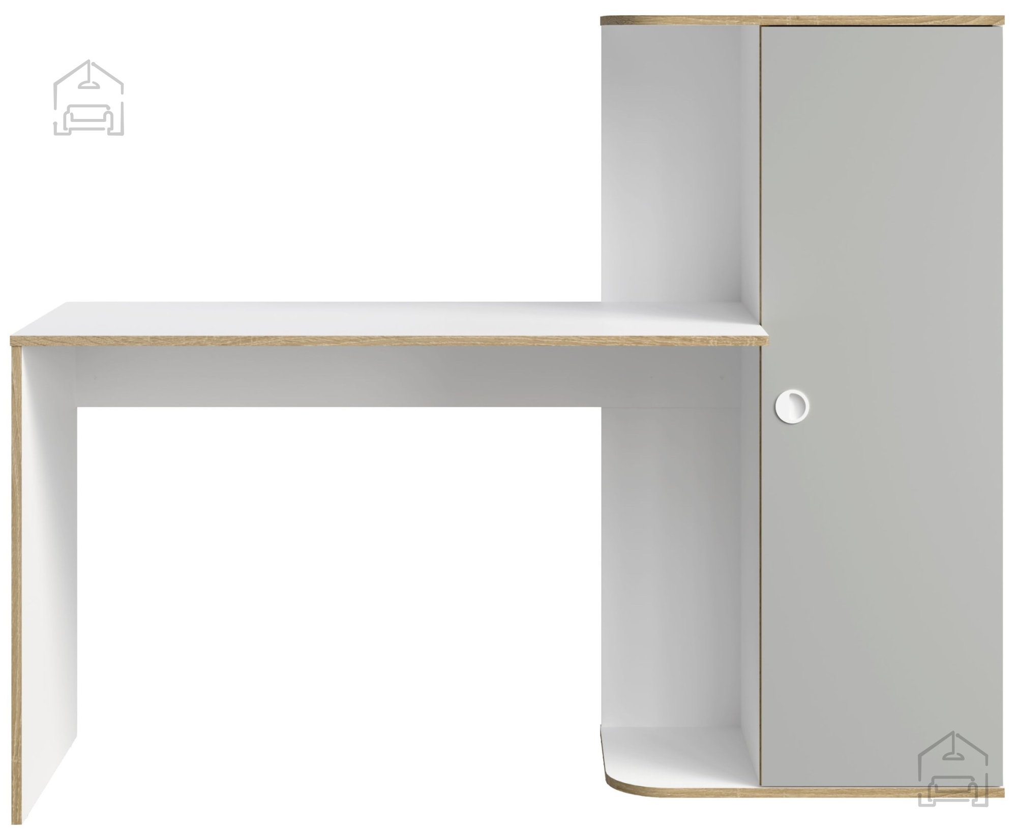 Miza vključuje omaro z vrati in tri priročne police, ki nudijo veliko prostora za shranjevanje knjig, map, zvezkov in drugih dodatkov. Na eni strani je prostor, namenjen postavitvi računalniške enote (PC ohišja), kar omogoča urejeno in pregledno delovno okolje. Takšna razporeditev spodbuja red in organiziranost, saj imate vse pomembne predmete vedno pri roki.