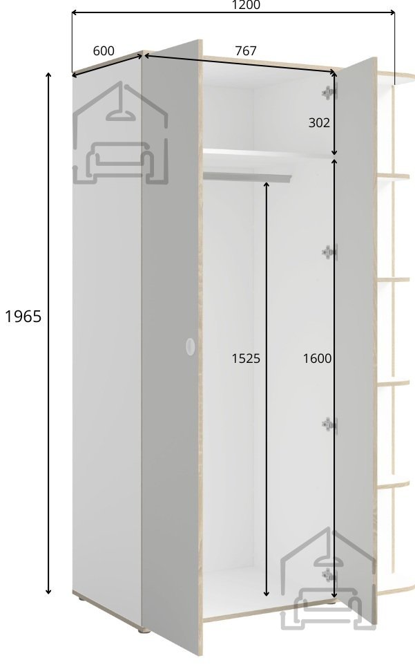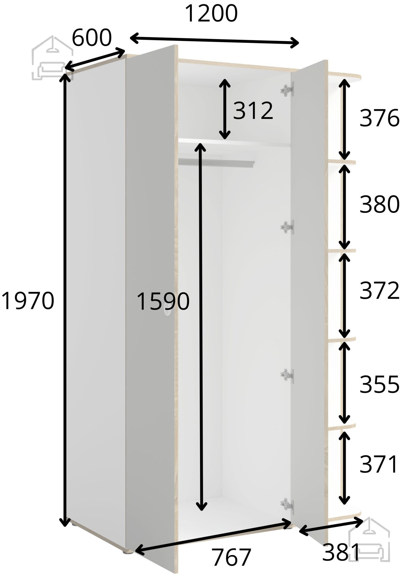 Omara s skupnimi dimenzijami 120x60x196,5 cm ponuja veliko prostora za shranjevanje oblačil, dodatkov in drugih osebnih predmetov. V notranjosti se nahaja obešalna palica za oblačila, ki jih želite imeti brez gub, več polic za zložene kose ter dodatni prostor ob strani, namenjen shranjevanju predmetov, ki zahtevajo poseben dostop ali ločeno ureditev. Takšna razporeditev omogoča preglednost in urejenost, hkrati pa ohranja dnevno sobo ali spalnico brez odvečnega nereda.