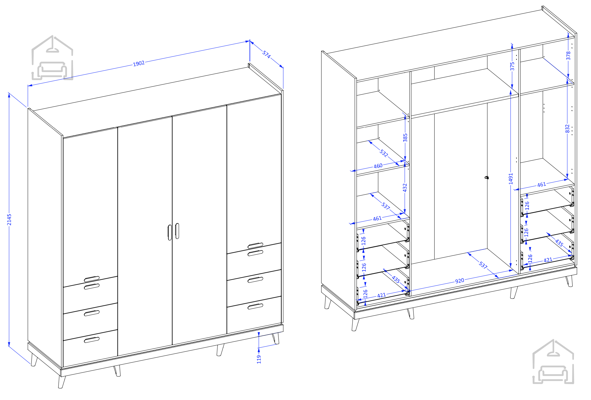 Garderobna omara Scandi 2 se ponaša s pametno razporeditvijo notranjosti, ki omogoča optimalen izkoristek prostora. Z štirimi vrati in šestimi prostornimi predali boste imeli dovolj prostora za shranjevanje vseh svojih oblačil, dodatkov in sezonskih predmetov. Notranjost je zasnovana tako, da omogoča logično razporeditev – od visečih oblačil do zloženih kosov, čevljev in modnih dodatkov. Tako bo vaša garderoba vedno pregledna, urejena in dostopna.