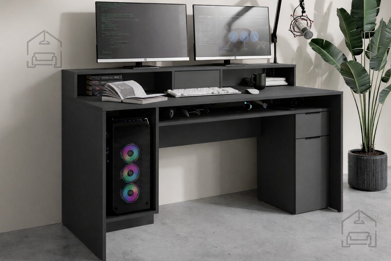 Grafitna barva daje mizi sodoben, elegantno resen videz. Ta odtenek se odlično ujema z drugimi barvami in materiali, kot so svetel les, kovina ali bela barva sten. Zaradi nevtralne barvne sheme je mizo mogoče enostavno vključiti v obstoječo notranjo opremo – tako v moderno opremljene prostore kot tudi v klasične pisarne. Grafitni ton doda prostoru pridih profesionalnosti in urejenosti.