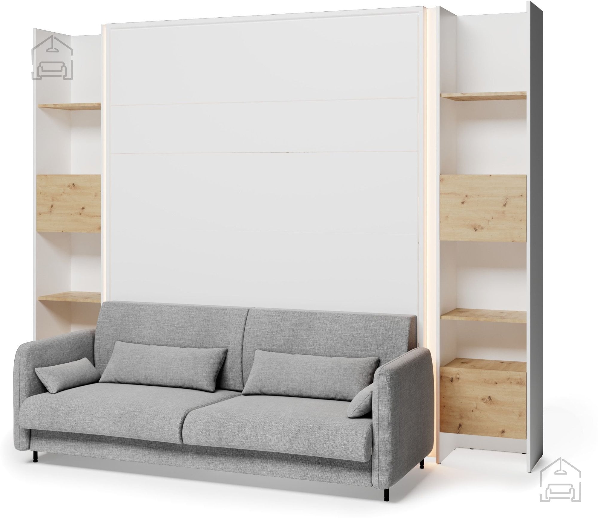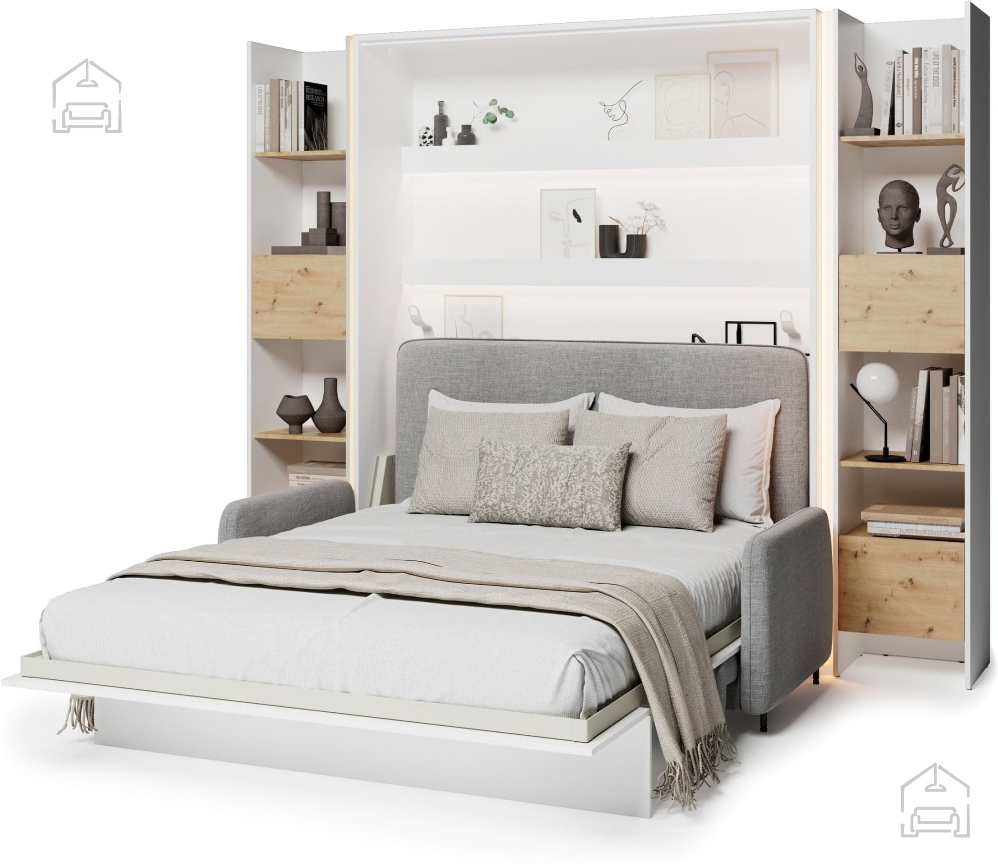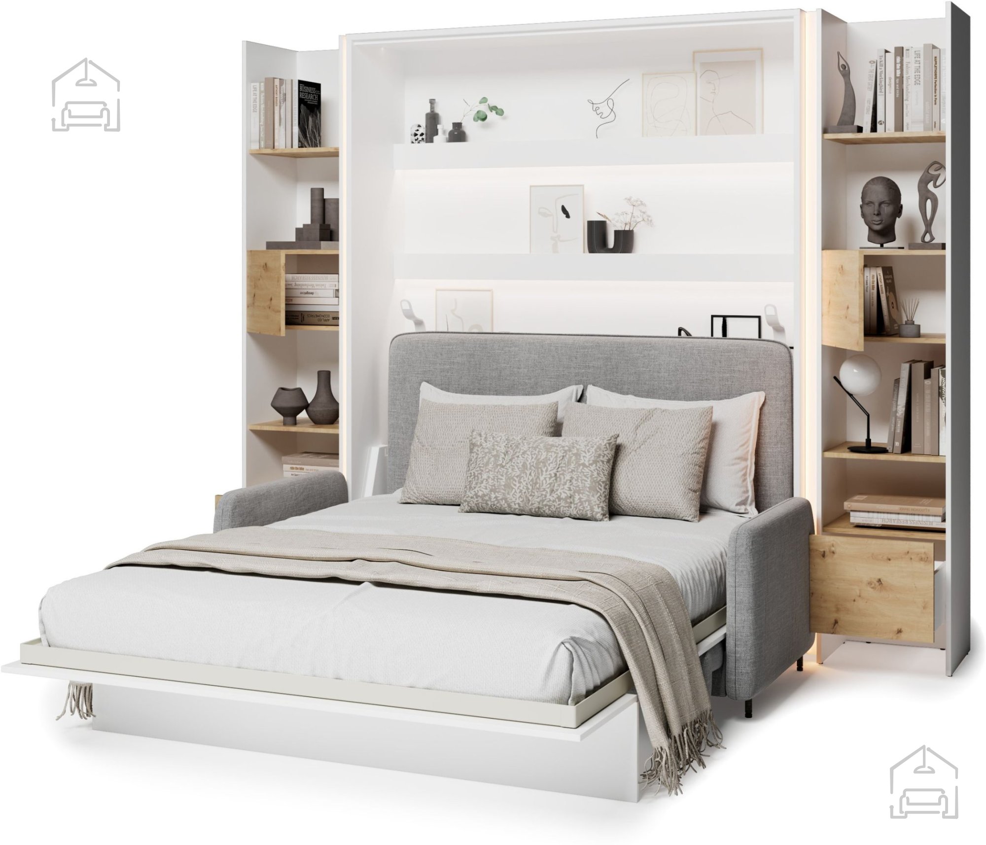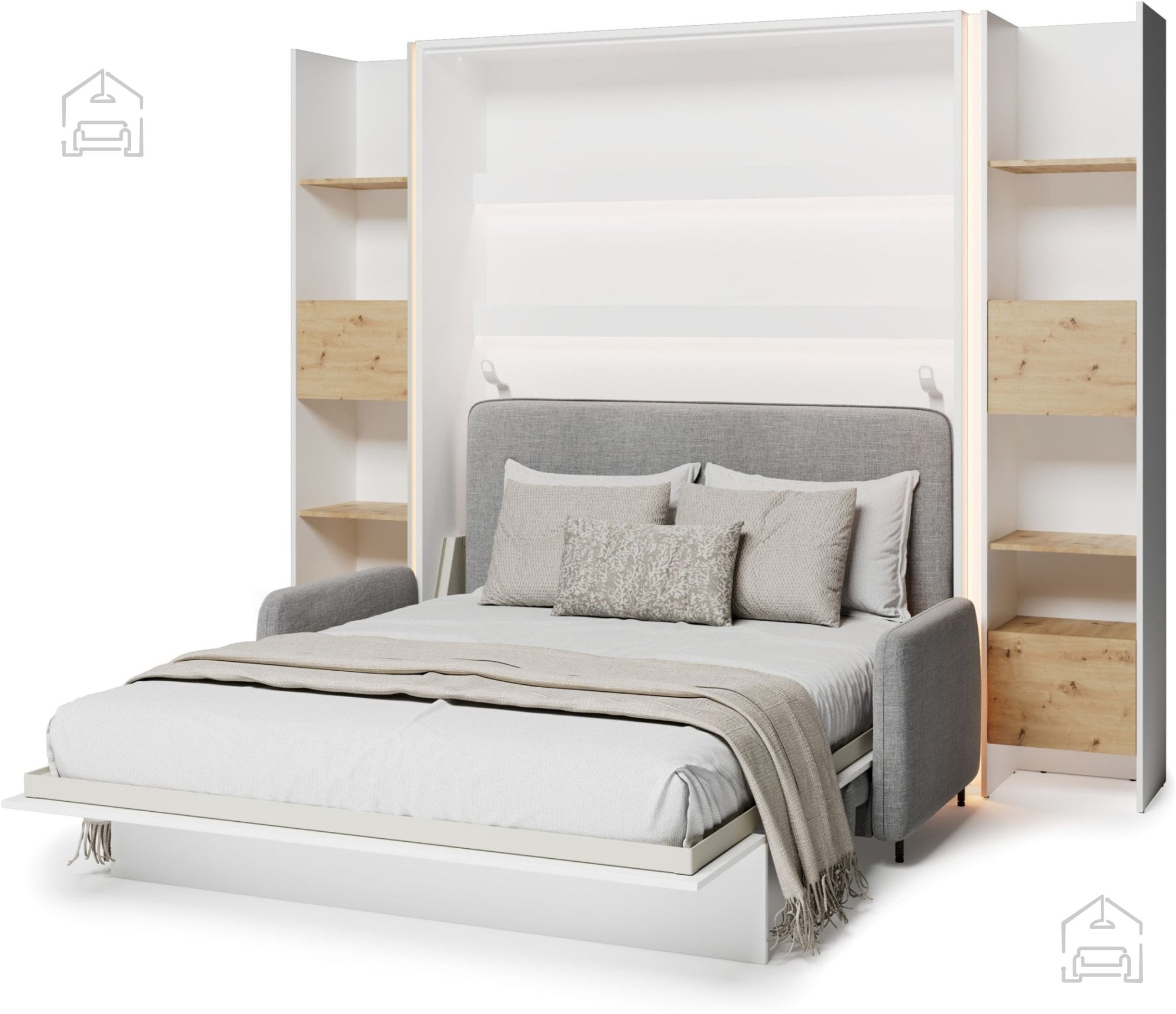 Komplet: trosed BC-19 siv, Postelja v omari BC-12 - 160x200 cm - bela, vzglavje BC-17 sivo, LED luč, 2x LED luči za postelje BC - bela, 2x Regal BC-23 - artisan/bela, 2x LED luč z USB, Vzmetnica Pocket Roll mini cocos - 160x200 cm
