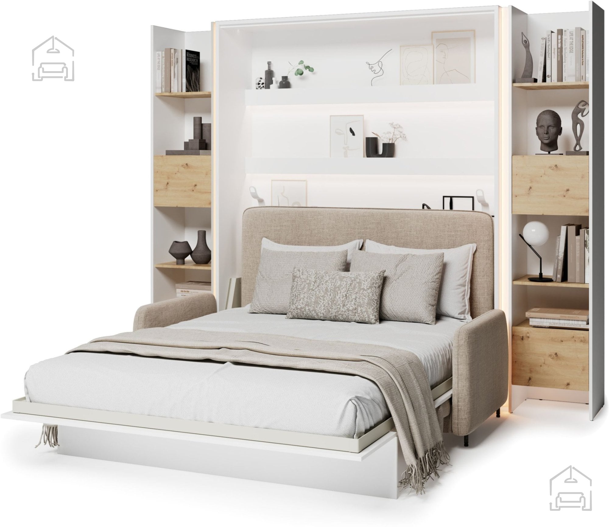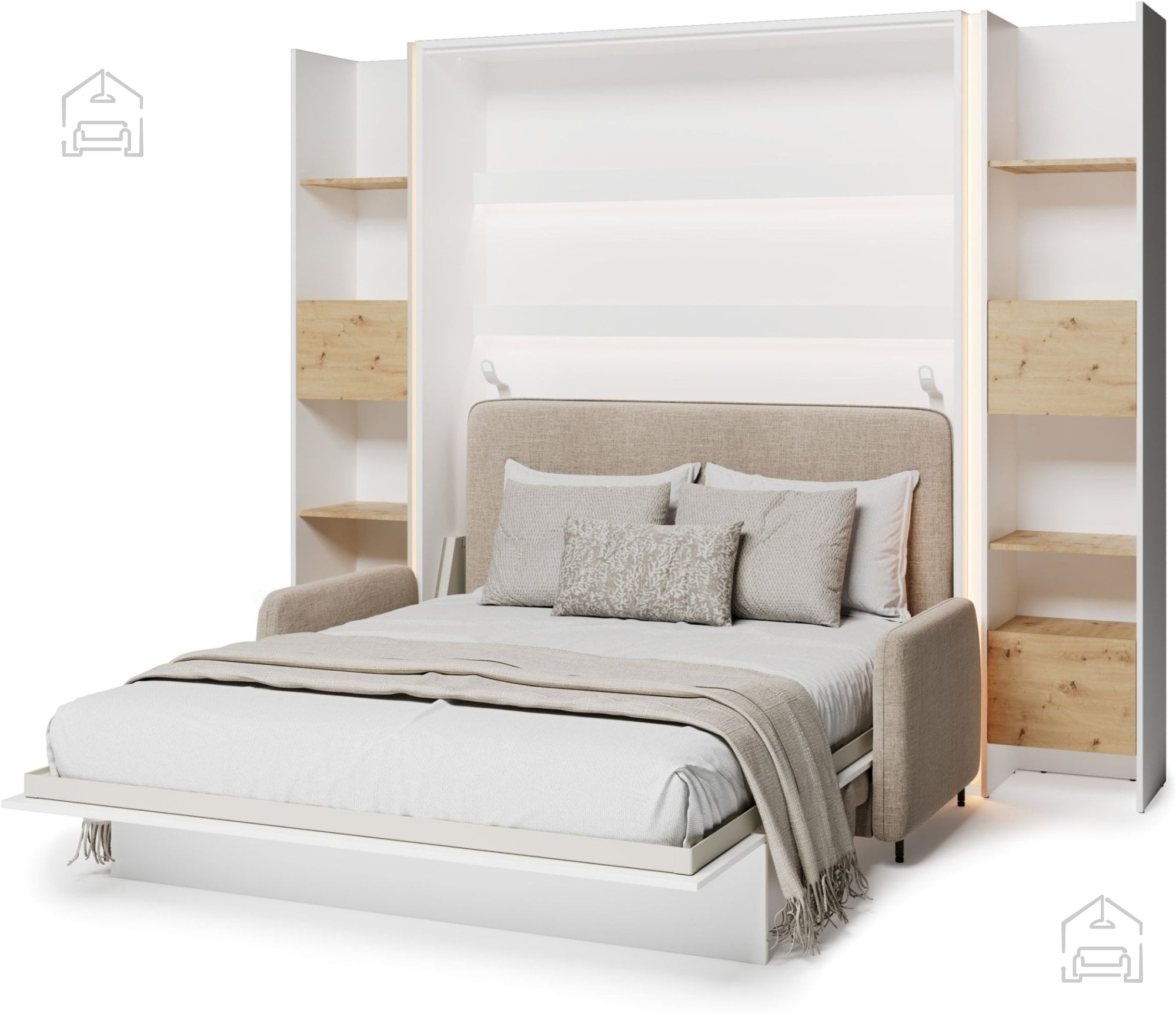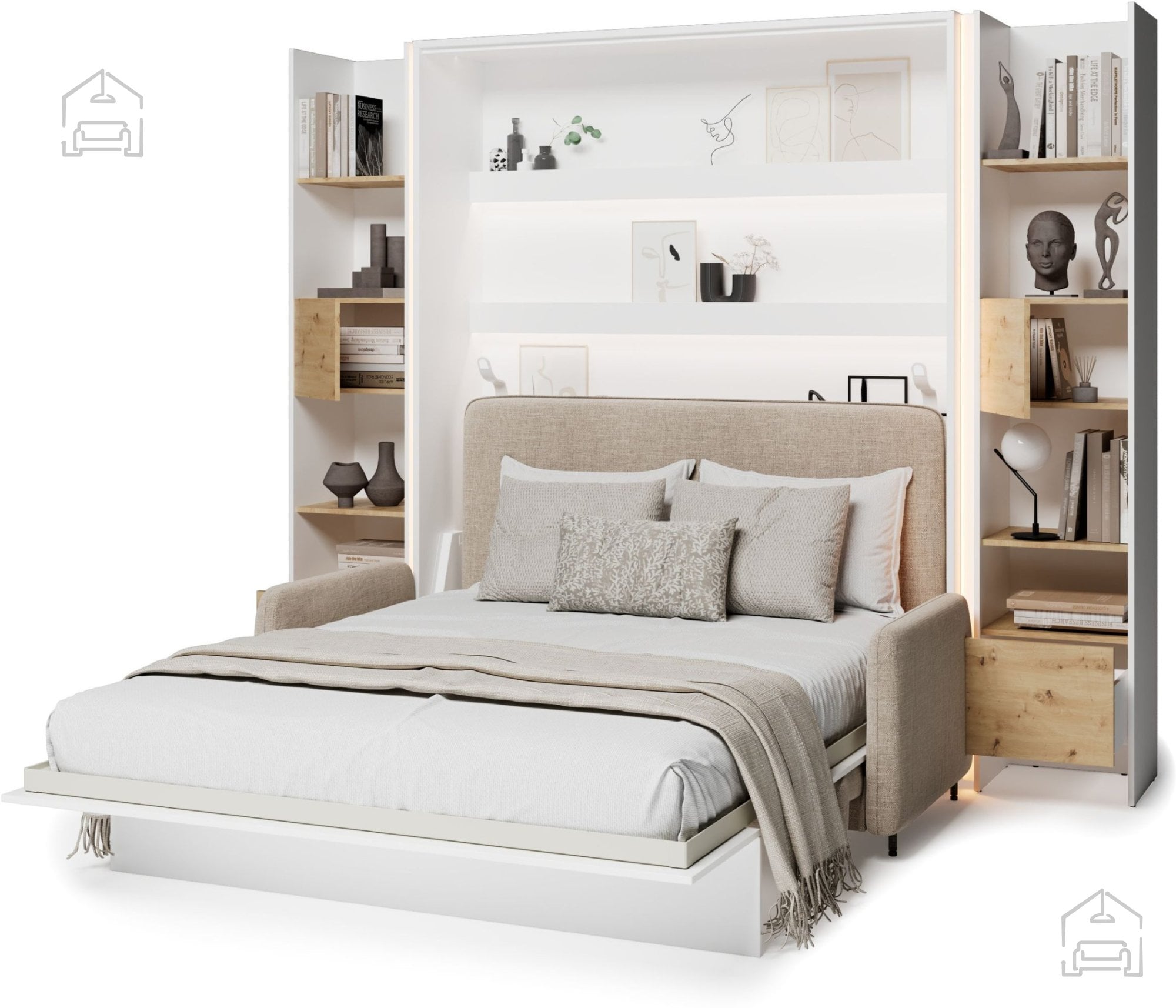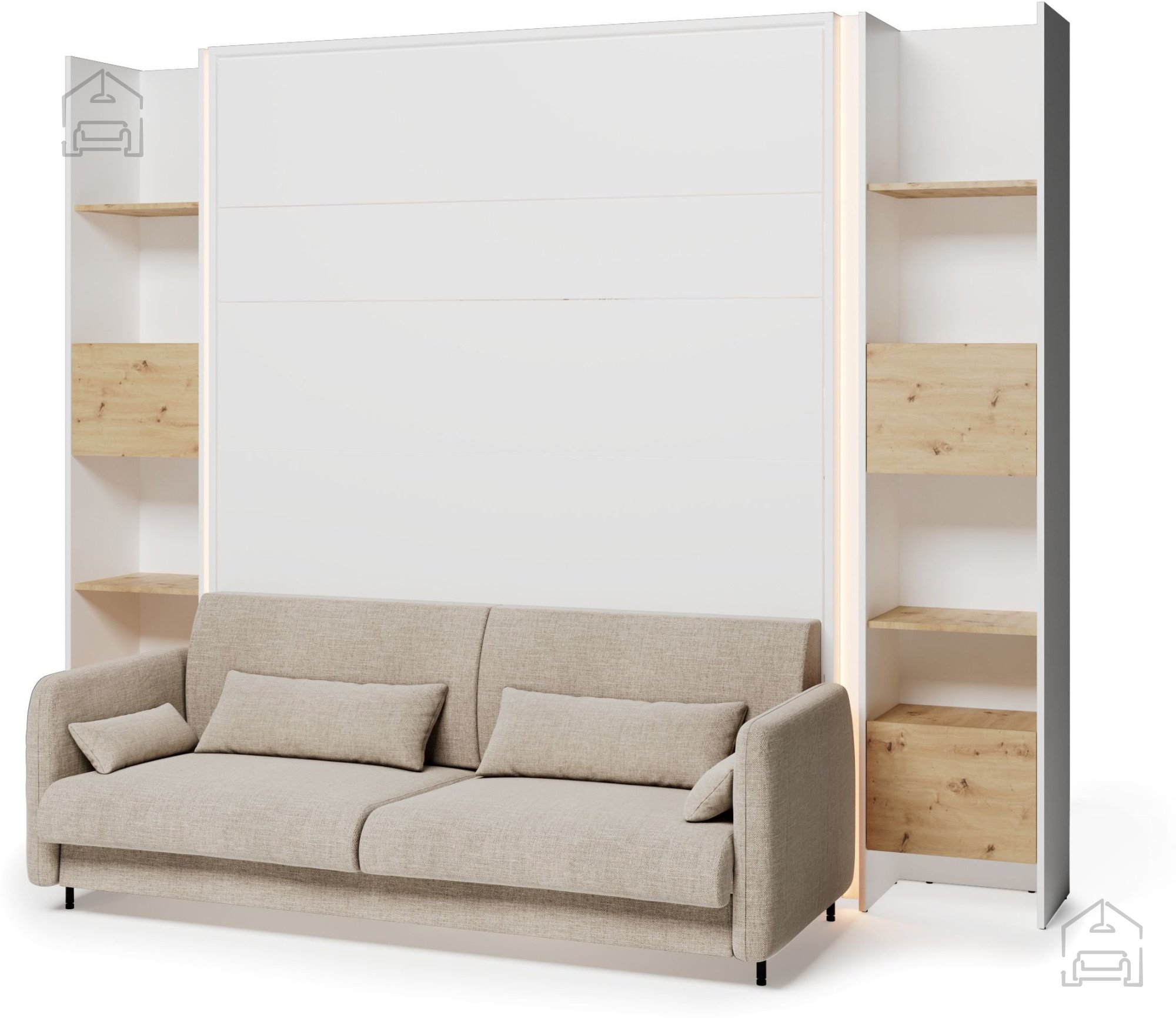 Komplet: trosed BC-19 bež, Postelja v omari BC-12 - 160x200 cm - bela, vzglavje BC-17 bež, LED luč, 2x LED luči za postelje BC - bela, 2x Regal BC-23 - artisan/bela, 2x LED luč z USB, Vzmetnica Pocket Roll mini cocos - 160x200 cm