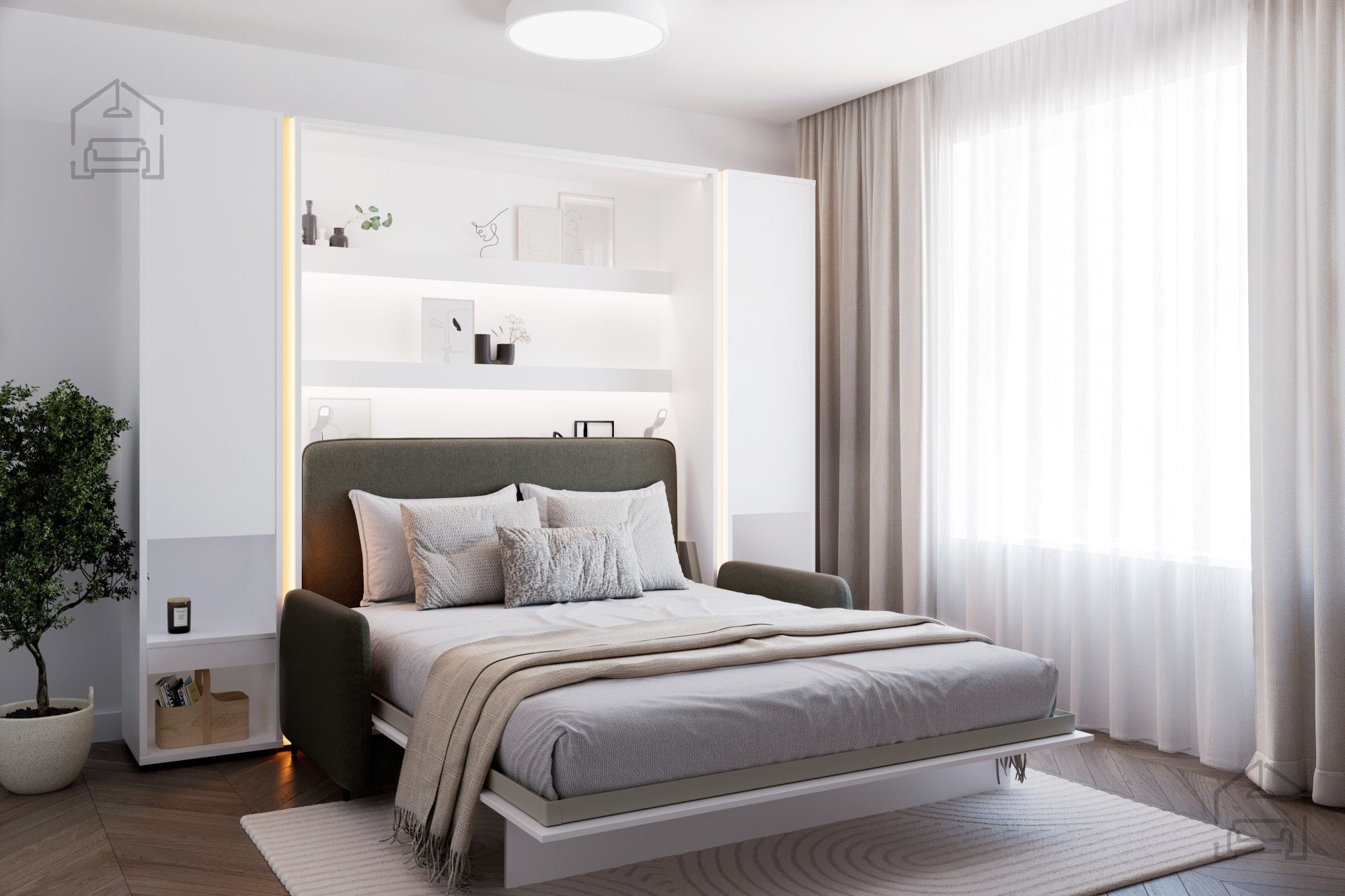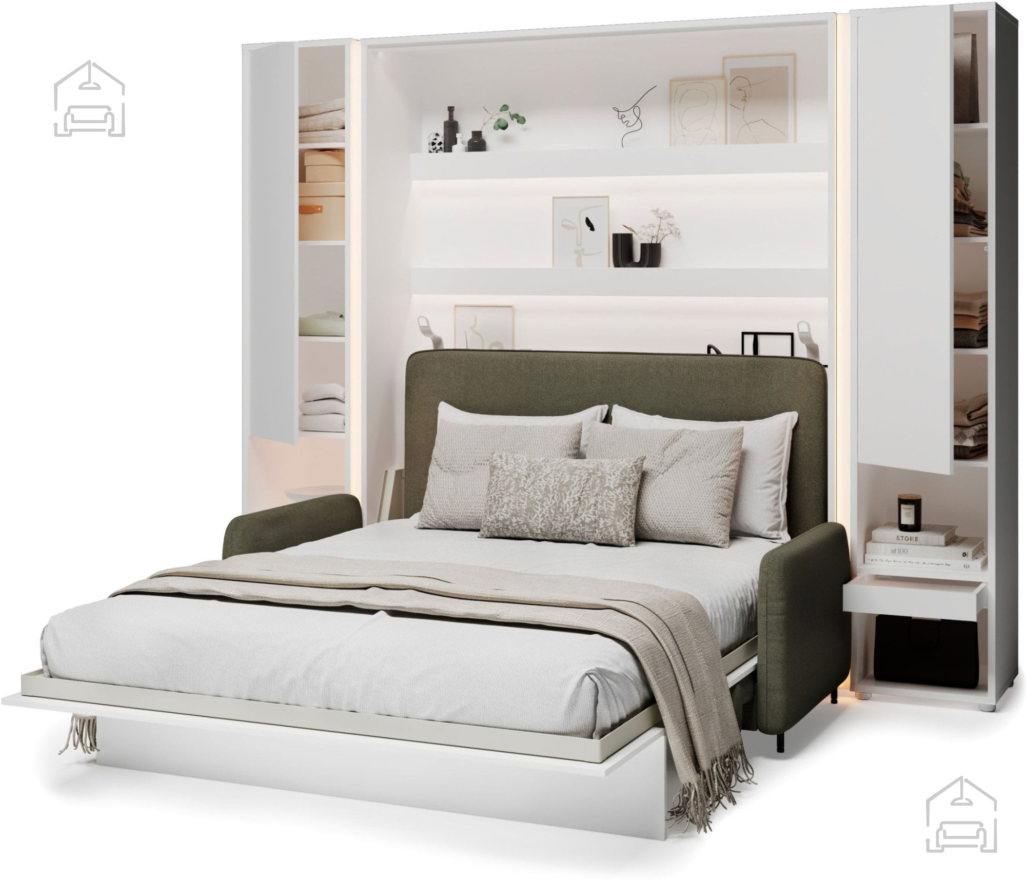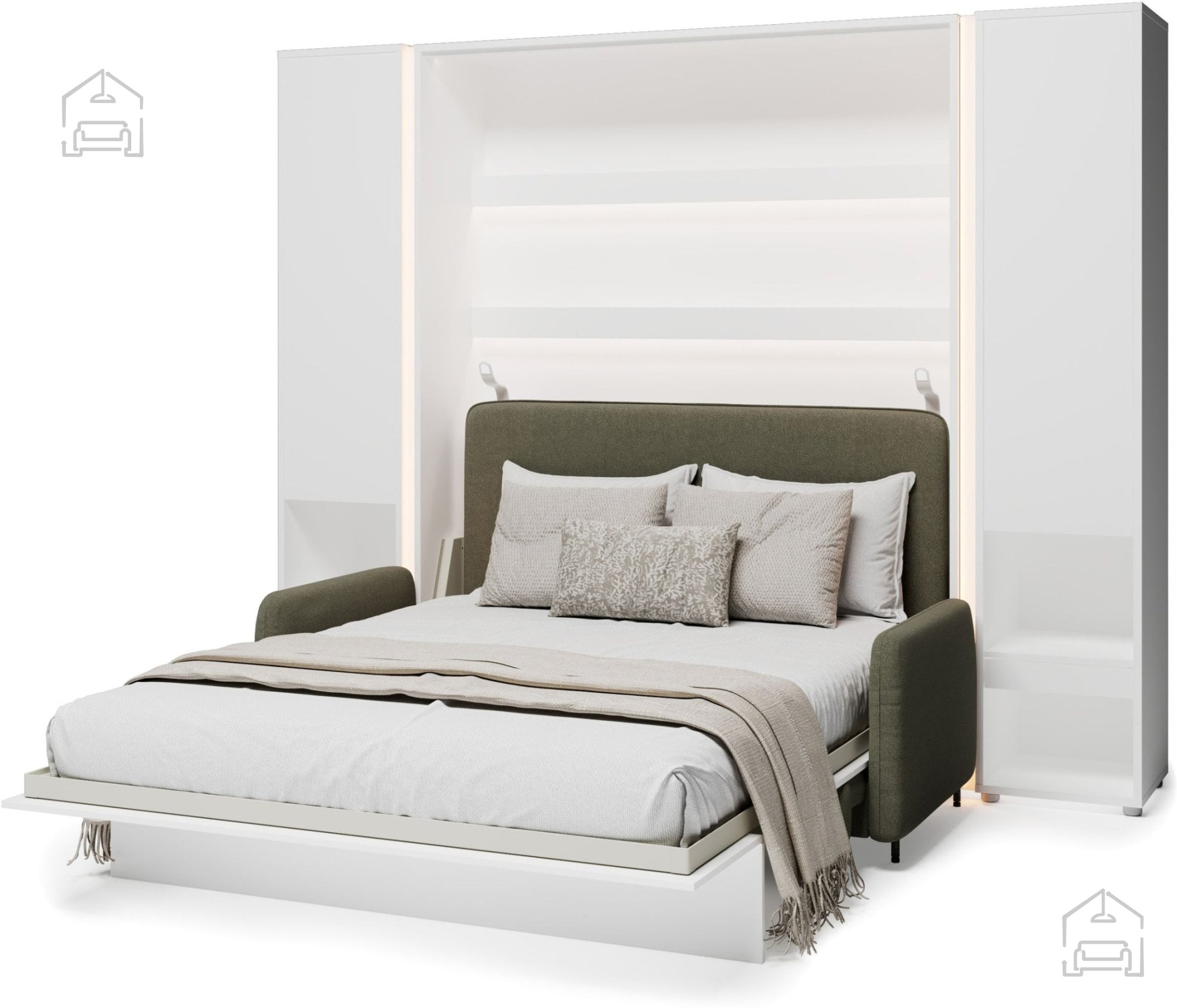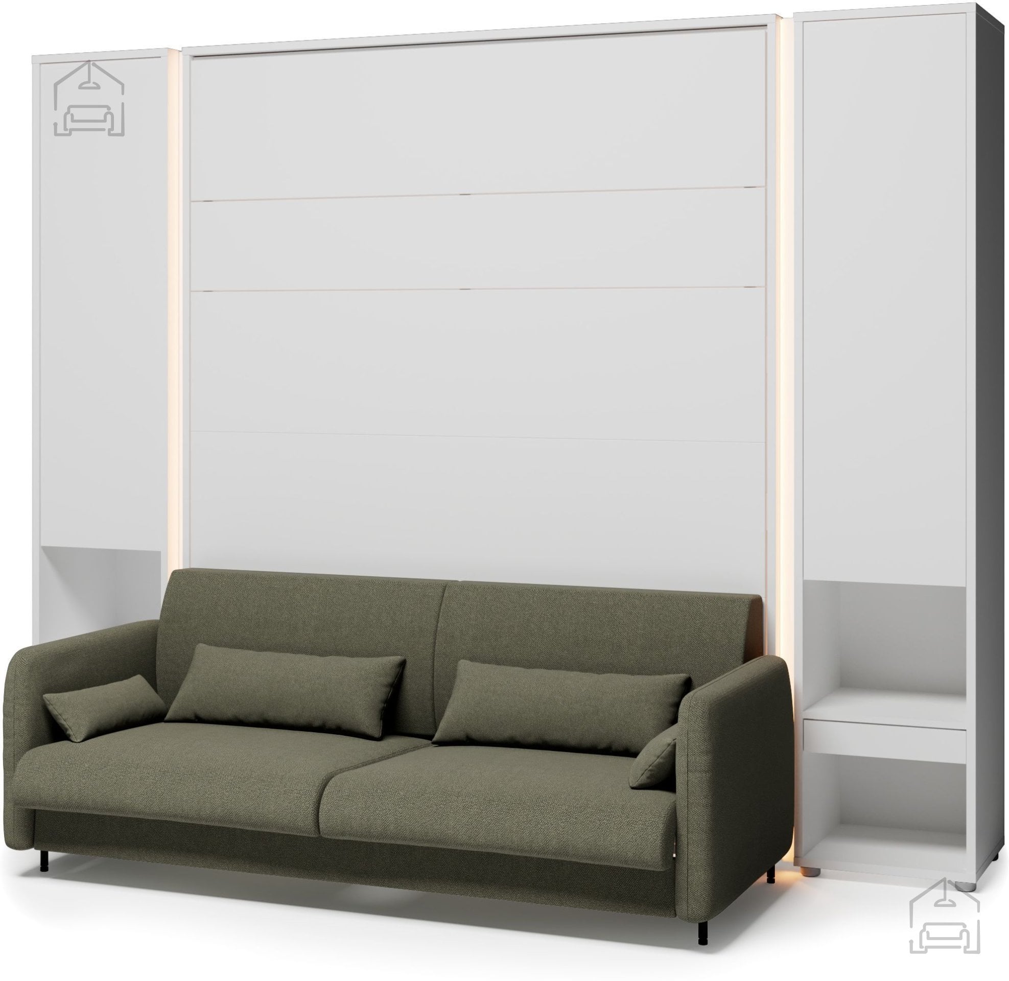 Komplet: kavč BC-19 zelen, Postelja v omari BC-12 - 160x200 cm - bela, vzglavje BC-17 zelena, LED luč, 2x LED luči za postelje BC - bela, 2x omara BC-07 - bela, 2x LED luč z USB, Vzmetnica Pocket Roll mini cocos - 160x200 cm