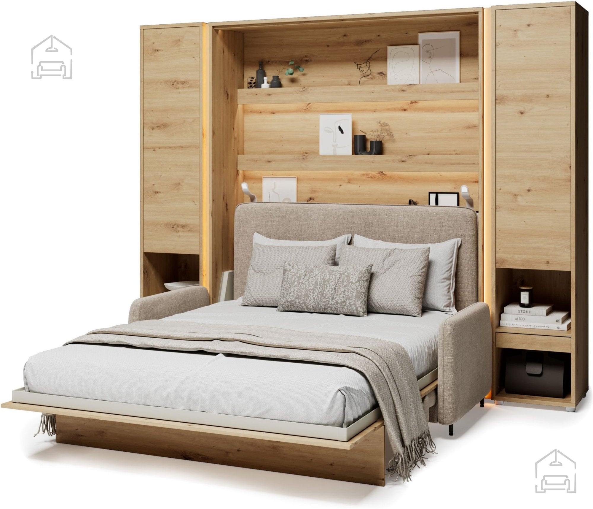 Komplet: kavč BC-19 bež, Postelja v omari BC-12 - 160x200 cm - artisan, vzglavje BC-17 bež, LED luč, 2x LED luči za postelje BC - artisan, 2x omara BC-07 - artisan, 2x LED luč z USB, Vzmetnica Pocket Roll mini cocos - 160x200 cm